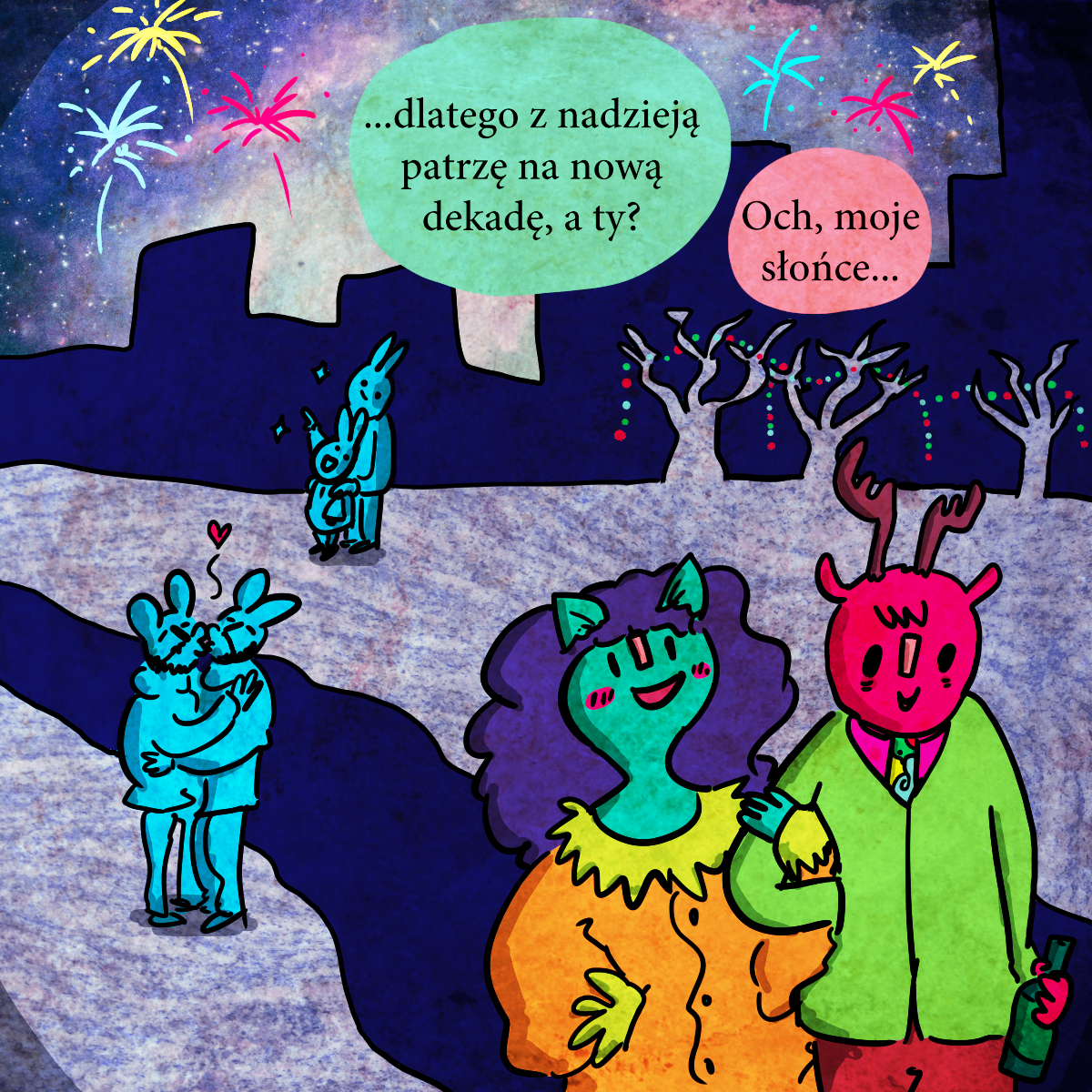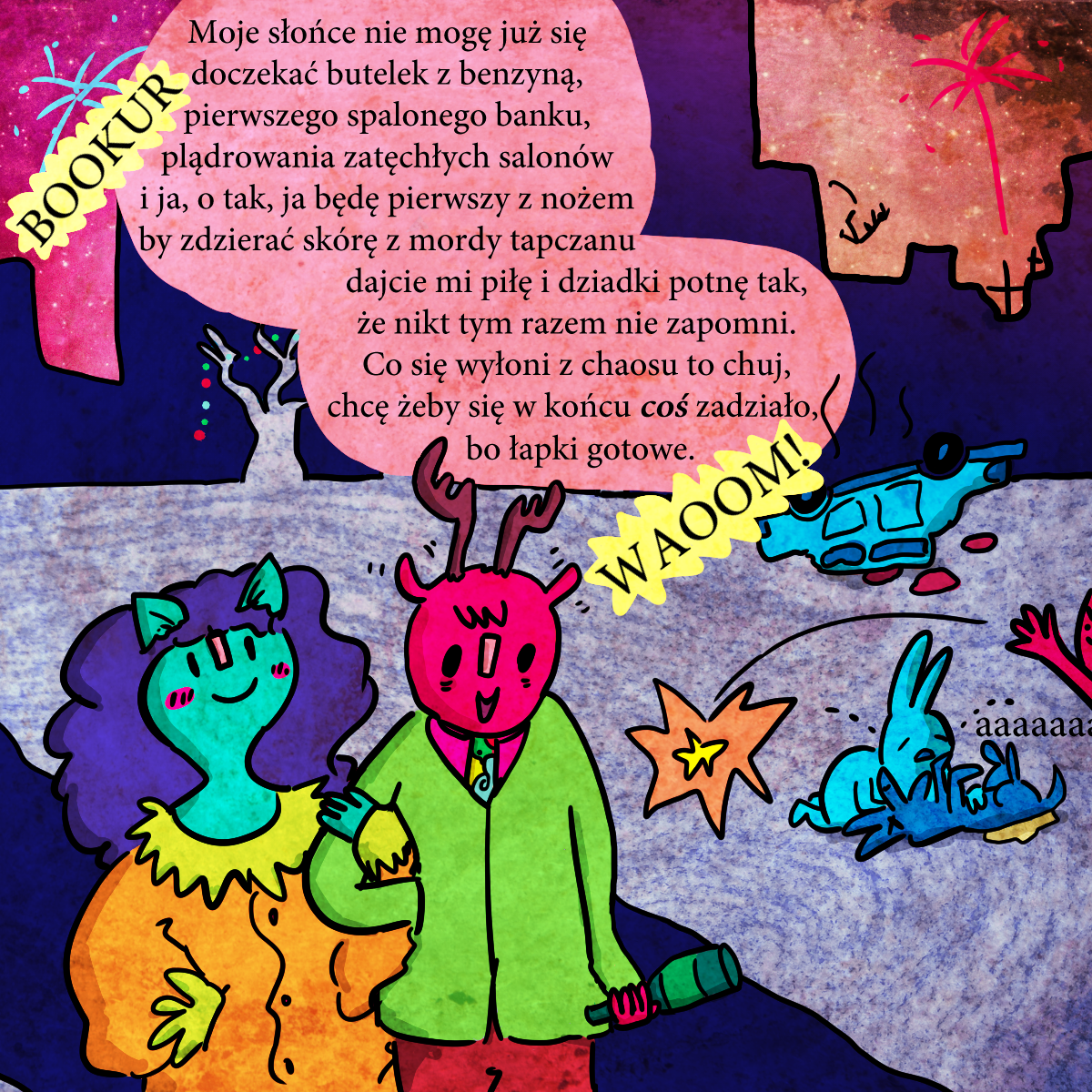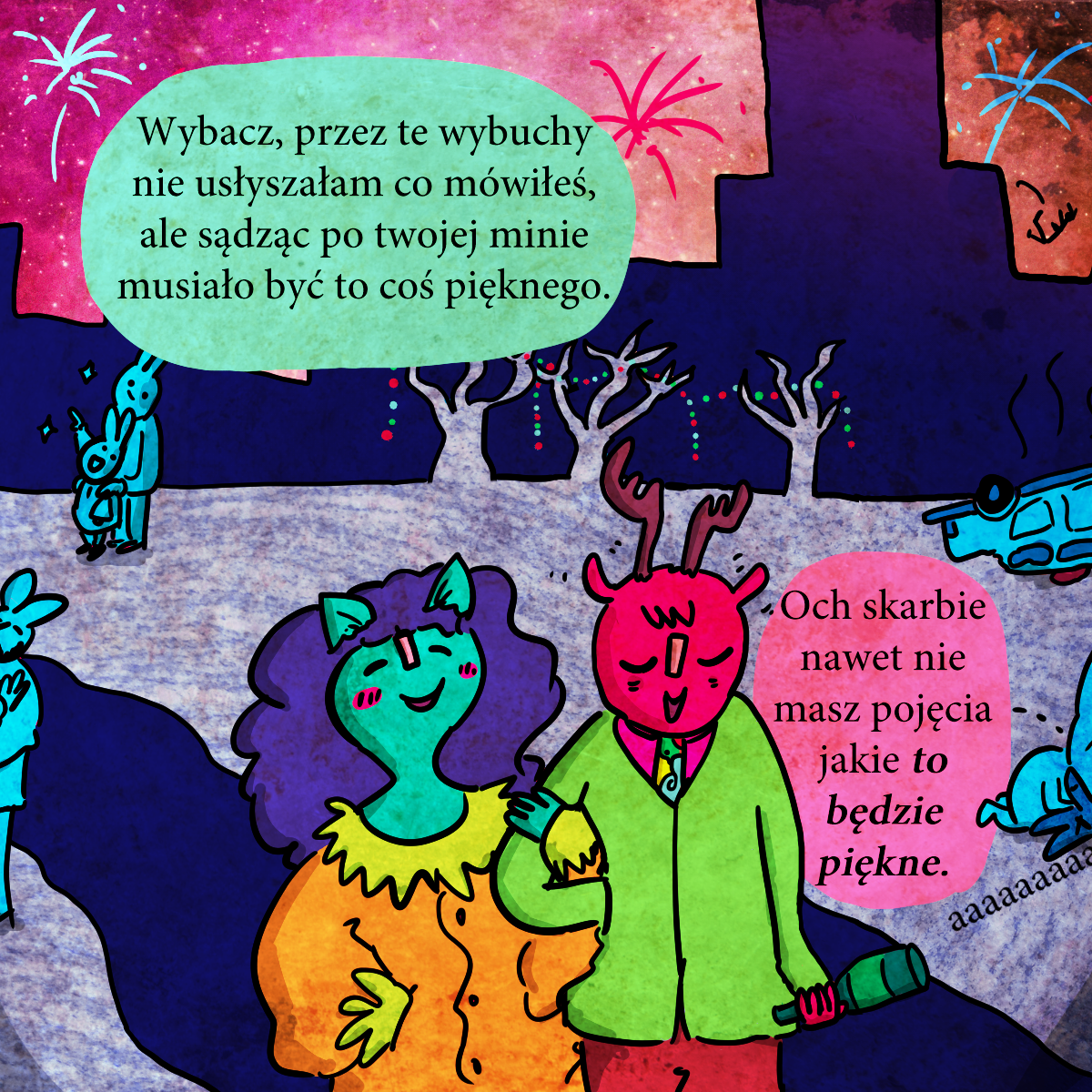 W komiksie jest nawiązanie do Wesela Wyspiańskiego: „Myśmy wszystko zapomnieli; mego dziadka piłą rżnęli”, gdzie była mowa o rabacji galicyjskiej. W tego sylwestra też jakiś typ się wjebał w rondo na pełnej kurwie i dachował. Stąd ten samochód w tle.
