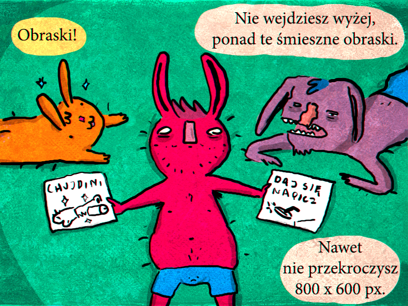 Kontynuując myśl z poprzedniego postu na temat kryzysu, bycie INTERNETOWYM rysownikiem komiksowym daje wiele powodów do czucia się gorszym. Otoczenie internetowe sprawia, że nazywa się to, co robisz, kontentem, a mówiąc ściślej terminologią specjalistyczną, obraskiem w internecie. Komiksikiem. Coś co mignie i jest rel, albo meh. Nie drukujesz poważnego albumu, nie będziesz brany pod uwagę jako ktoś warty uwagi, wyróżnienia czy nagrody jury tego czy owego. Nawet nie dorastasz do poziomu zina. Kurczakiem nie dostaniesz. Internetowi bieda Raczkowscy, jak dobrze pójdzie z zaangażowaniem politycznym i autocenzurą, to może czasopismo was przygarnie. Dobra dosyć skamlania! Mamo bierz kamerę! Przekroczyłem 800 x 600! Mam swoją stronę! Płacę za to, żeby mnie oglądano! Brawo! Wielki człowiek! Wielka chwila!