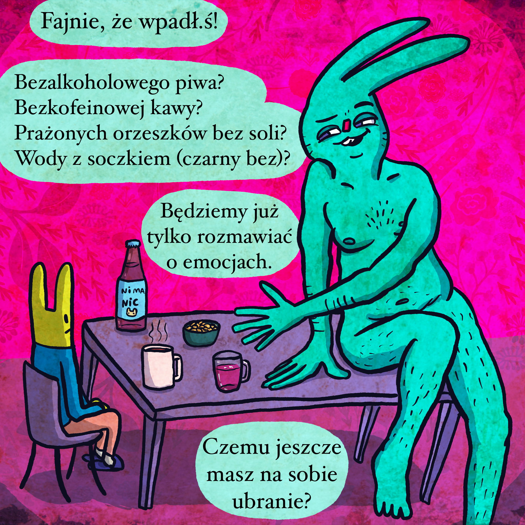 Najgorsze, że menu się zgadza z tym, na co ostatnio sobie pozwalam. Pije piwo bez alko (żeby nie wróciły stare nawyki), kawa bez kofeiny (bo mi koliduje z lekami na ADHD), orzeszki bez soli (żeby nie podjadać czymś gorszym), woda z soczkiem (bo mnie gardło napierdala). Stałem się nudny i mniej już sobie szkodzę, co mi odbiera sporą część inspiracji dla komiksów. No kurwa, będziemy najwyżej gadać o emocjach. Ściągaj gacie!