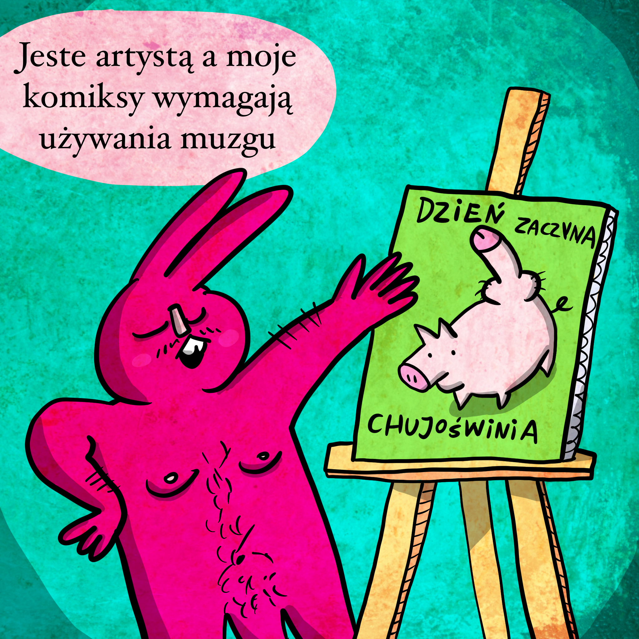 Mam z tym typem połączeń problem. Z jednej strony fajnie jest ukrócić pretensjonalność i odsiać sędziów dobrego smaku. Z drugiej jest to sposób na budowanie dystansu w przekazie. Jest to warstwa ironii budująca dystans. Nawet przy komiksach jednoznacznie szczerych odsłaniających wrażliwe punkty musi być ten bąk z dupy gdzieś w kącie, żeby nie było zbyt poważnie. Można powiedzieć, że to też dobry sposób na ucięcie wszelkiej krytyki artystycznej, bo to tylko takie wygłupy. Idealny system obronny, przy którym można w wygodnej chwili wyjąć kartę trolla, śmieszka i błazna. Trzecia sprawa to swoisty autosabotaż. Szkielety pomysłów można popchnąć w poważniejszym kierunku, adekwatnym do wernisażu, druku, pokazania mamie i byłej wychowawczyni. Recenzent będzie mógł zerknąć i opisać na blogu bez dawania taga NSFW. Ale prostacki humor to taka cudowna ślepa uliczka, zero perspektyw na status artysty. Co najwyżej wyklętego, ale nie tak fajnie, tylko tak żenująco wykluczonego.