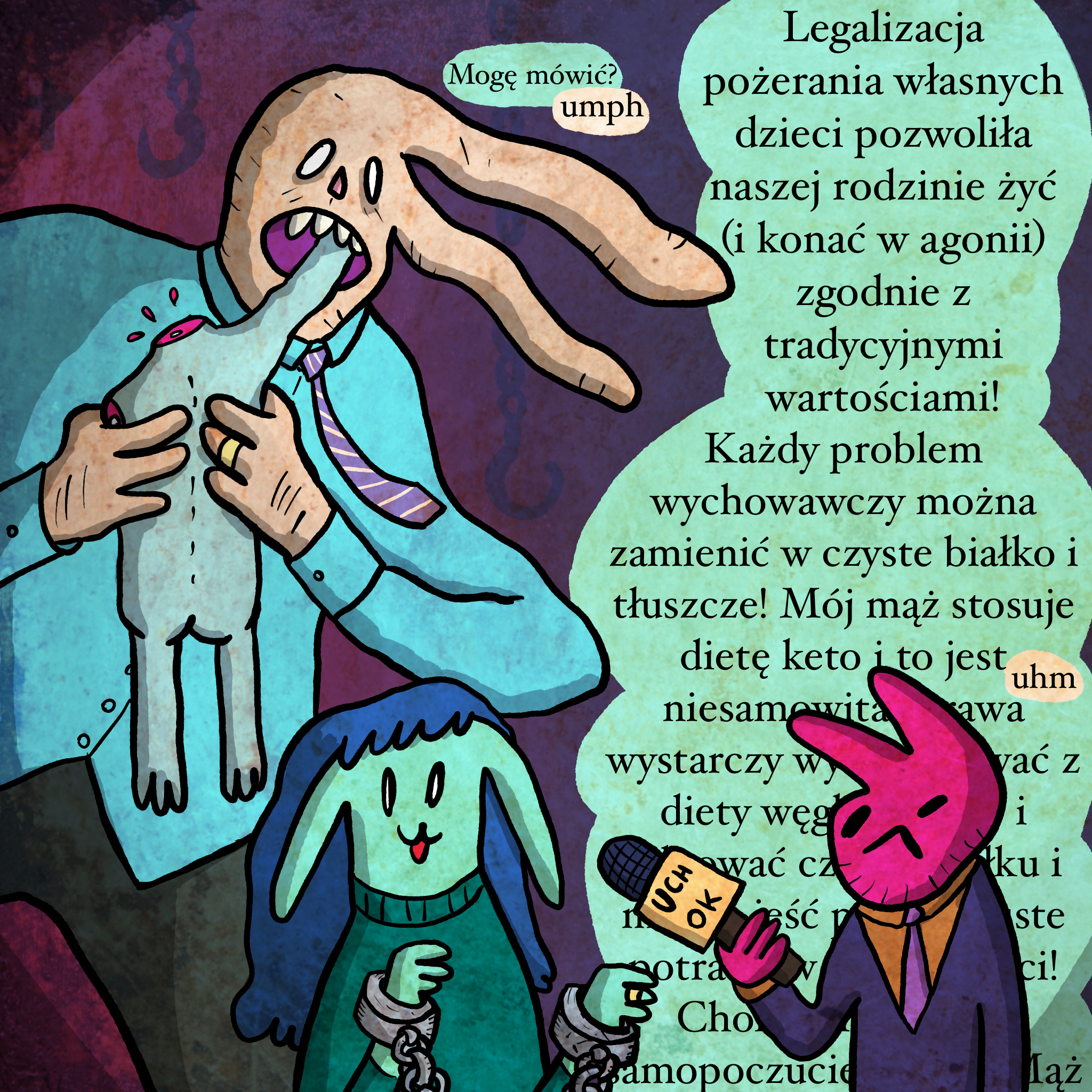 Przechodząc do komiksu, nawiązuje do obrazu Goi „Saturn pożerający własne dzieci”. Narysowałem parę w formie nowoczesnej konserwatywnej rodziny, wielkomiejskie biznes korpoludki w stylu Mentzena, dbające o swój wizerunek i lifestyle jak z  kolorowego magazynu, łączące to z byciem absolutnymi światopoglądowymi troglodytami. Jaram się smartwatchem apple i biciem rodziny po alkoholu.