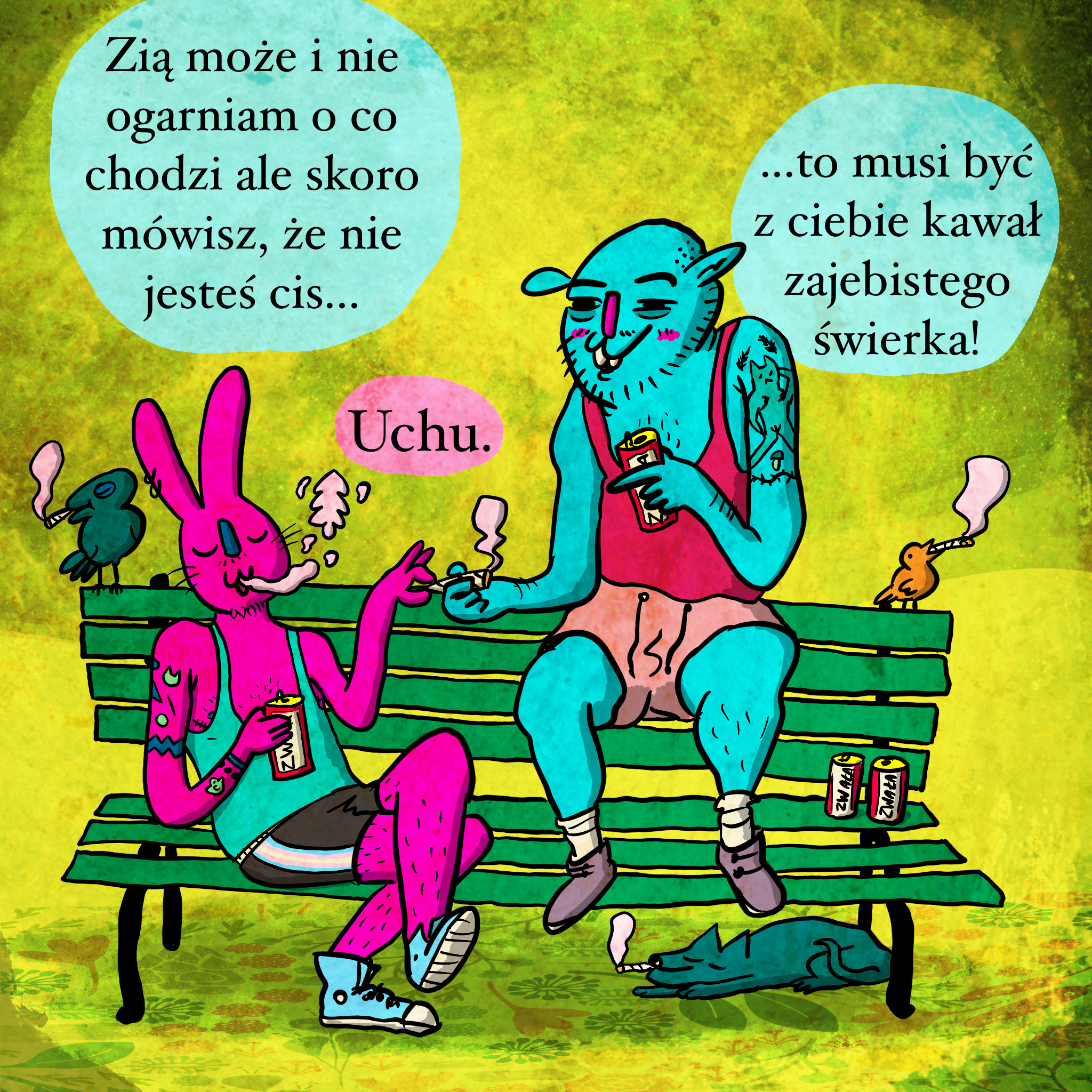Transpłciowość w troszkę pozytywniejszym scenariuszu. Jakby ktoś nie wiedział: cis (nie czytać z ć!) jest każdy, kto identyfikuje się z płcią przypisaną przy urodzeniu, przeciwieństwem tego jest trans. W komiksie jest trans facet z cis facetem na ławeczce, przy browarku, przy blanciku, czilera bez przypału. A że zielsko sprzyja grze skojarzeń, ziomo skojarzył cis z drzewem cisem i tak snuje rozkminy bez żadnych złośliwości.