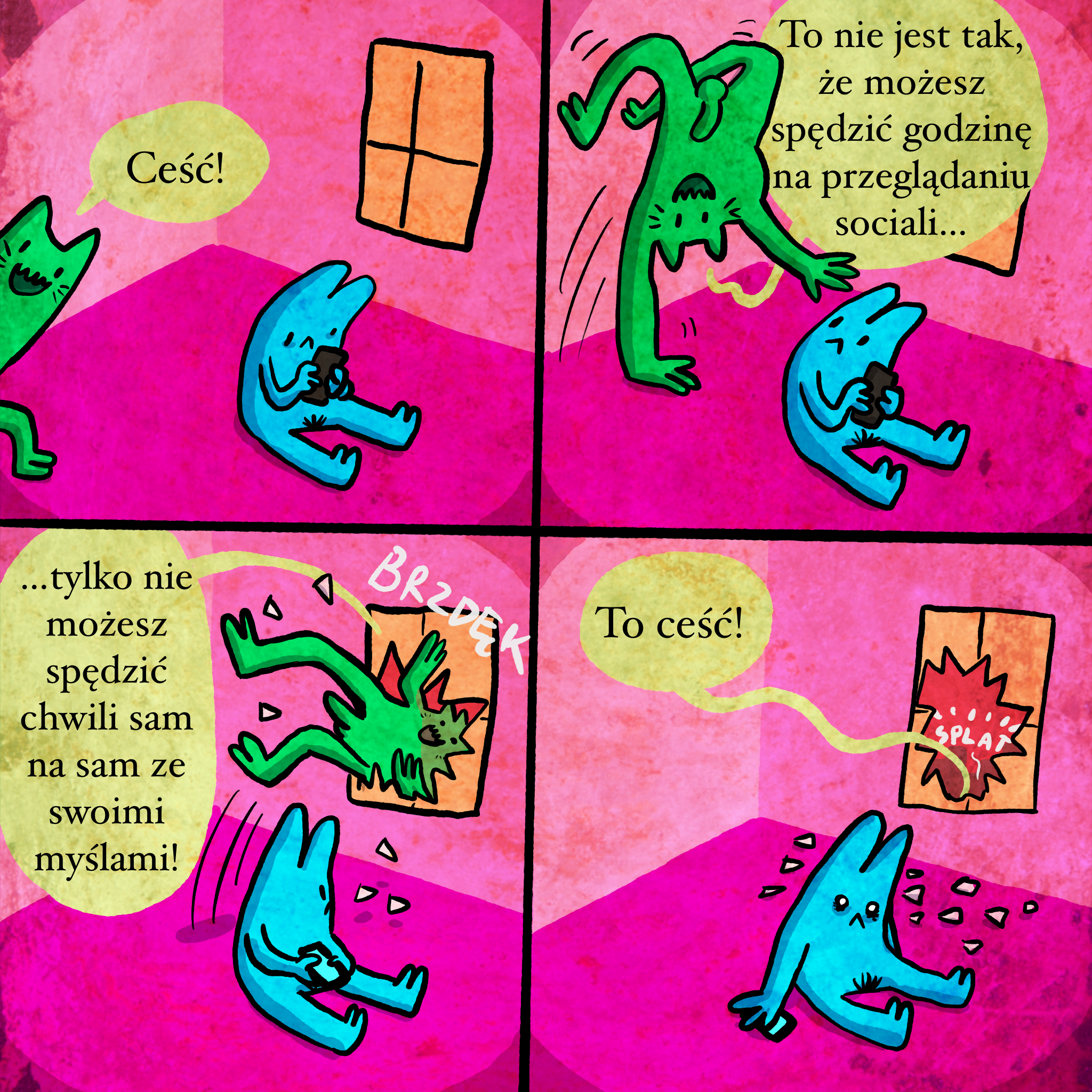 W sumie nie przeglądam tyle sociali, co konsumuję masę youtubowych filmików, nawet w trakcie mycia. Tyle, że mechanizm jest ten sam. Odmóżdżanie pomaga zagłuszyć lęki i całe to pierdolenie w głowie, zwłaszcza jak się jest zmęczonym, wtedy nie muszę myśleć o tym, jak bardzo jestem zmęczony. Wszystko fajne, tylko oglądanie też męczy i odrealnia otaczający świat. I tak to się żyje w tym XXI-wiecznym pierdolniku.