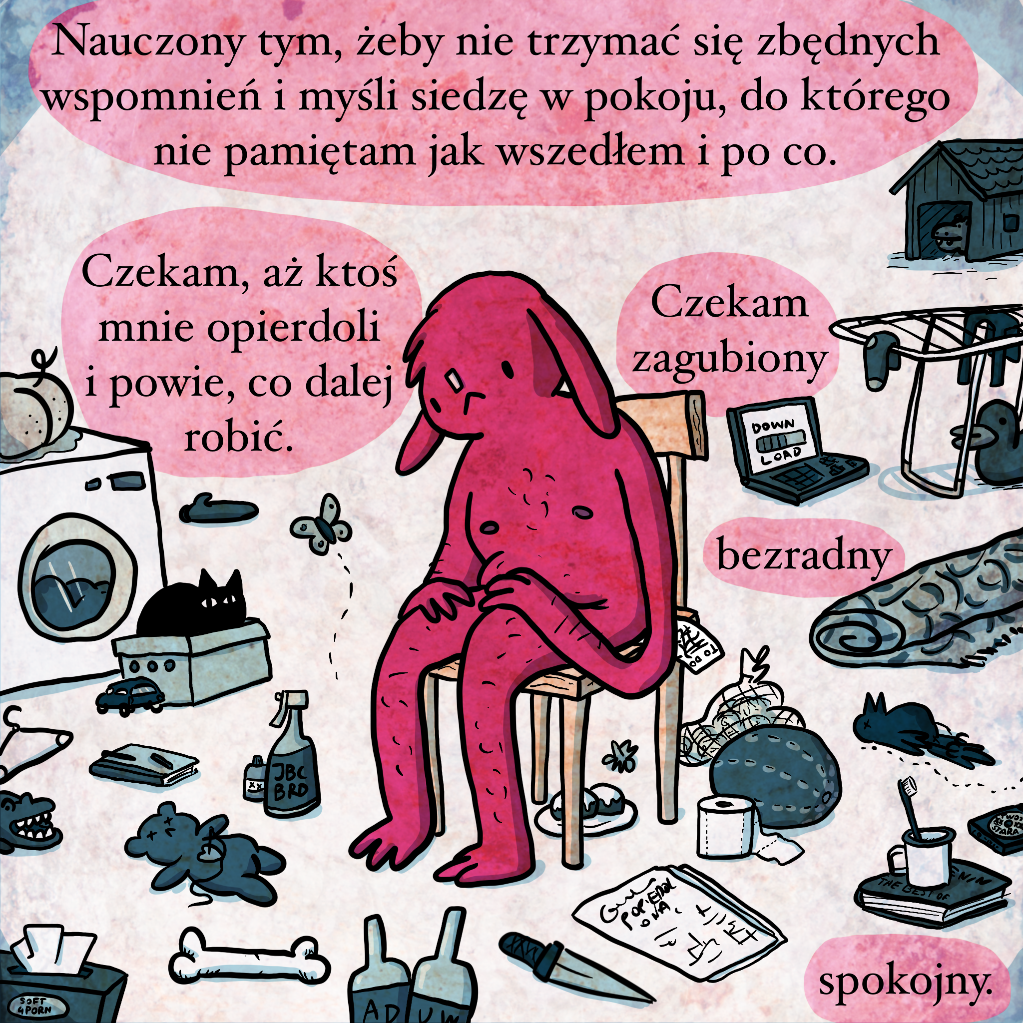 Problemy ogarniania codzienności. Nie wiadomo od czego zacząć, po co się poszło, gdzie jest rzecz, bez której nie możesz zacząć sprzątania i uczucie, że powinieneś coś zrobić, ale nie wiesz, co. Więc czekasz, aż może ktoś pomoże i popchnie Cię w dobrym kierunku. To stan typowy dla osób, których rodzice kontrolowali cały czas, albo robili wszystko za nich i gdy nie ma tego czynnika wyręczania myślenia, wszystko się rozsypuje. A jeszcze jak połączymy to z ADHD, to już zupełnie nie wiesz, co się dzieje. Najczęściej tak to wygląda u mężczyzn, których patriarchalny system uczy zrzucania odpowiedzialności za ogarnianie domu na kobiety, zwłaszcza decyzji, co powinno się zrobić. Kiedy bałagan jest bałaganem. Stara ci mówiła zawsze, kiedy masz posprzątać pokój i tak może zostać. W tym podkaście był ciekawy moment (mam nadzieję, że dobrze trafiłem), gdy facet staje się kolejną udręką. Z drugiej strony, będąc facetem z ADHD nie wiesz, który nieogar jest efektem wychowania, a który zaburzenia. Poczuciu winy będzie wszystko jedno, pojawi się tak czy siak.