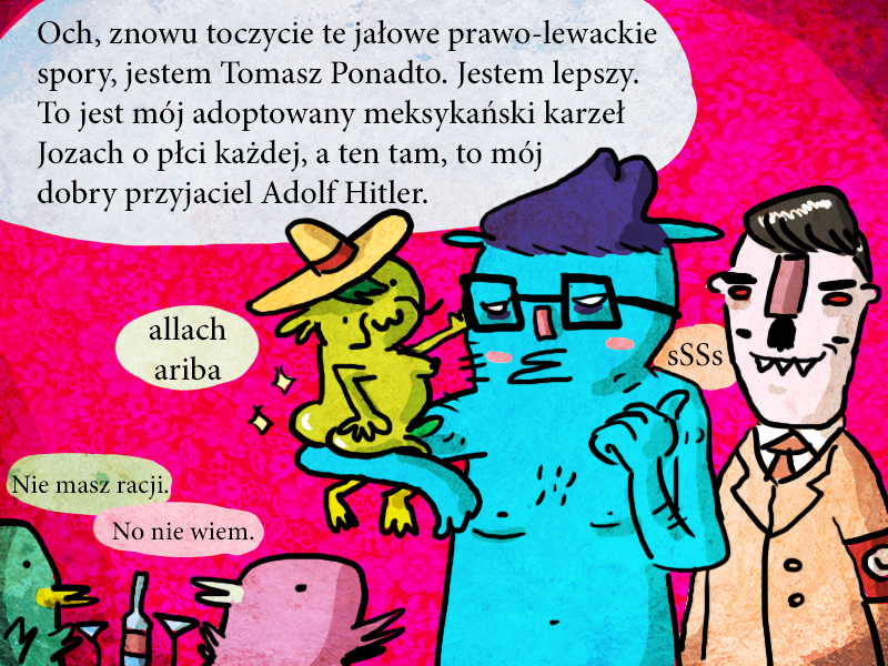 Zainspirował mnie kawałek Stromae – bâtard, jak sobie zerkniecie na tłumaczenie tekstu, to jest dokładnie o tym samym. Nie można być po wszystkich stronach, nie można być po żadnej stronie. Obojętność i brak reakcji to zawsze wsparcie strony uciskającej i silniejszej. Twój kolega Adolf Hitler tylko czeka na twoje słowa wsparcia, chęć do dialogu z nim i dbanie o wolność słowa. Rozumiem brak reakcji spowodowany strachem, nie każdy jest w stanie się postawić, ale stawianie apolityczności na sztandarze jako cnotę to już gówno totalne.