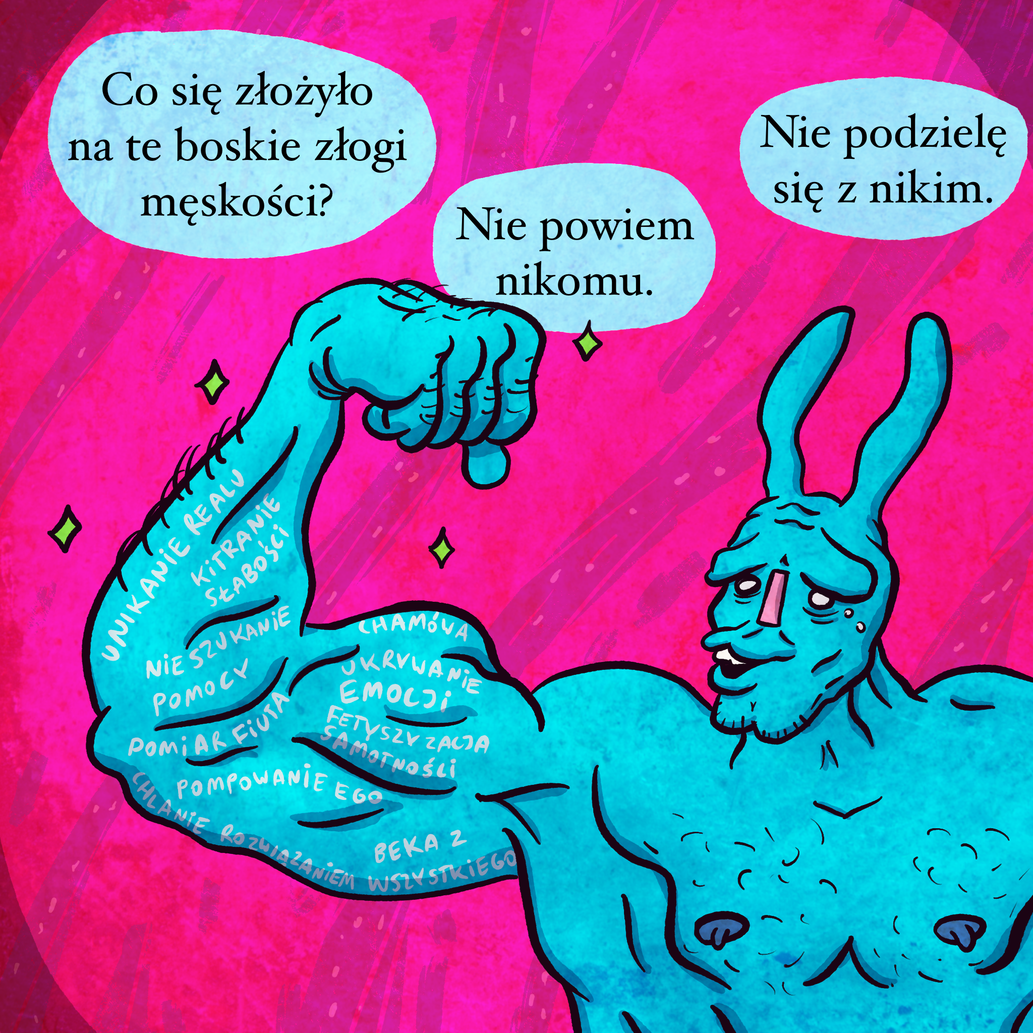 Żeby nie było, że mam coś do ludzi jarających się siłką. Sam lubiłem ćwiczenie w ramach wf-u na studiach. Chodzi o fasadę twardziela, którą męscy mężczyźni tak usilnie próbują utrzymywać. Do tego pilnują, żeby wszyscy panowie wokół też robili to samo, bo każdy musi grać w tę grę w męskim panoptykonie. Od toksycznej męskości się robią złogi, których ciężko się potem pozbyć terapiami i pracą nad sobą. Grunt to spierdolić od tego środowiska, póki się ma przebłysk samoświadomości i siłę do zmian.