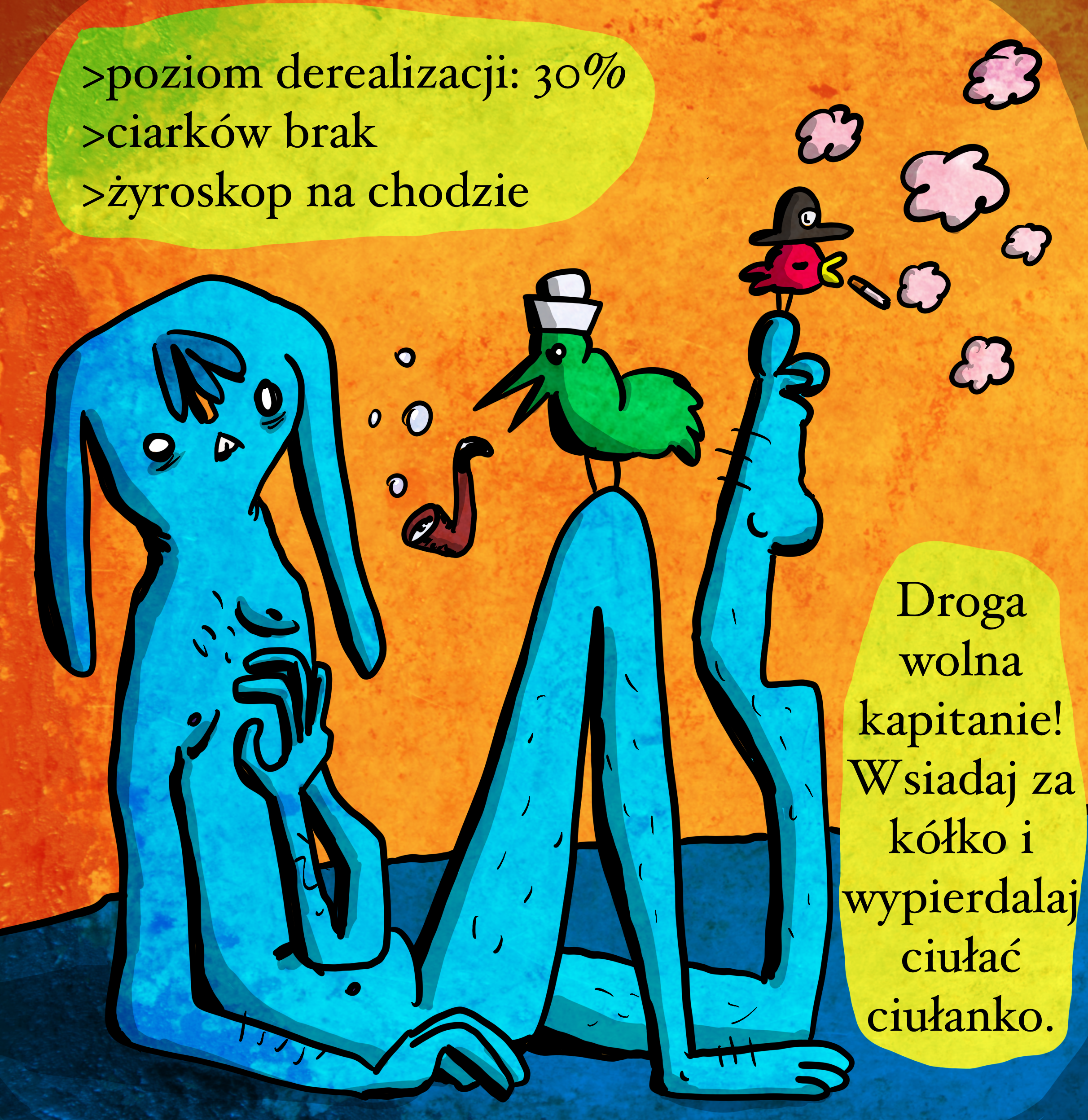 Komiks o tym, jak chujowo jest jeździć do pracy samochodem, gdy musisz, a brak snu i stany depresyjne wypierdalają cię poza ciało. Chujowo spałem przez to, że próbowałem mieć życie poza pracą i móc spędzać więcej czasu ze swoją dziewczyną. Takie coś nawet ma swoją nazwę – „revenge bedtime procrastination” i jest nasilającym się zjawiskiem. Udało mi się narzucić zasadę spania co najmniej 7 godzin, nawet gdy się przez to spóźnię do pracy. Wolę się spóźnić, niż myśleć cały dzień, jak bardzo chciałbym nie żyć. Nie mówiąc o stwarzaniu niebezpieczeństwa na drodze. Niby odpalam autopilot i robię wszystko, jakbym jechał normalnie, ale nie ma mnie w środku podczas jazdy, myśli zamieniają się w papkę i chuj wie, co się dzieje wtedy z czasem reakcji. Czasami derealizacje wchodziły w tryb ultra, wtedy czułem mdlenie w głowie i ciarki. Do tego muszę wszystkimi siłami utrzymać skupienie, żeby zupełnie nie odlecieć. Nie polecam 0/10. Sen to zdrowie.