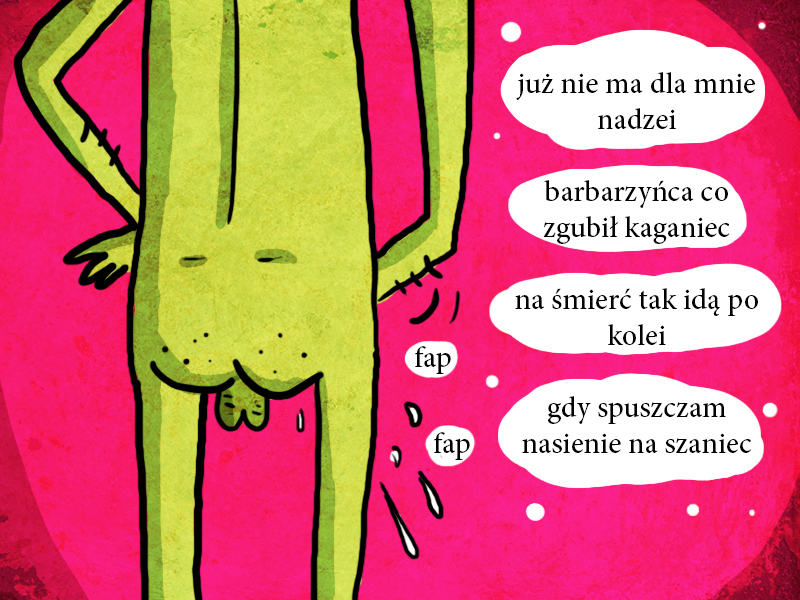 Nawiązanko do Testamentu Słowackiego, bo jedyna siła fatalna to moja dłoń gdy gniecie fiut, ukryta pod spodzieniem, niewidzialna.