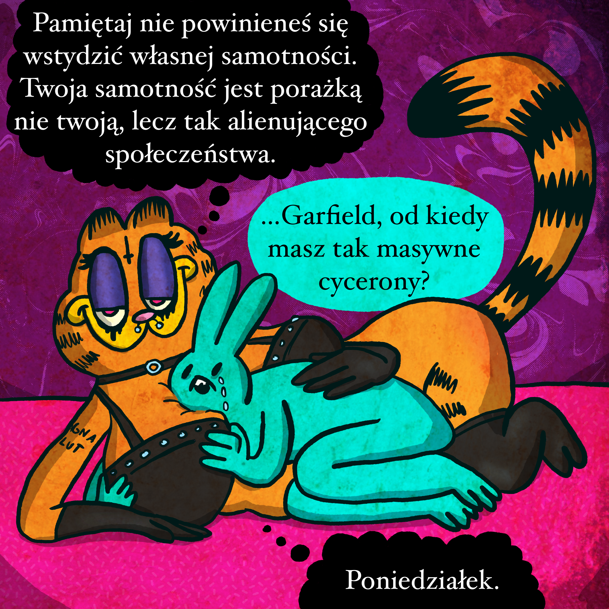 Cyce Garfielda wzięły się z tego komiksu, natomiast gotycki look z tego trendu. Czerpię inspiracje z najlepszych miejsc internetu. Poniedziałek to taka generyczna odpowiedź Garfielda z pasków. Monday jako dzień, w którym dzieją się rzeczy do kitu, szalone, chuj wie jakie. Tutaj pasuje też jako dzień nabycia cyca. Tfw (that feel when) no x gf, to taki memowy zwrot samotnych osób marzących o idealnej dziewczynie. Chyba z troszkę incelowym vibem.