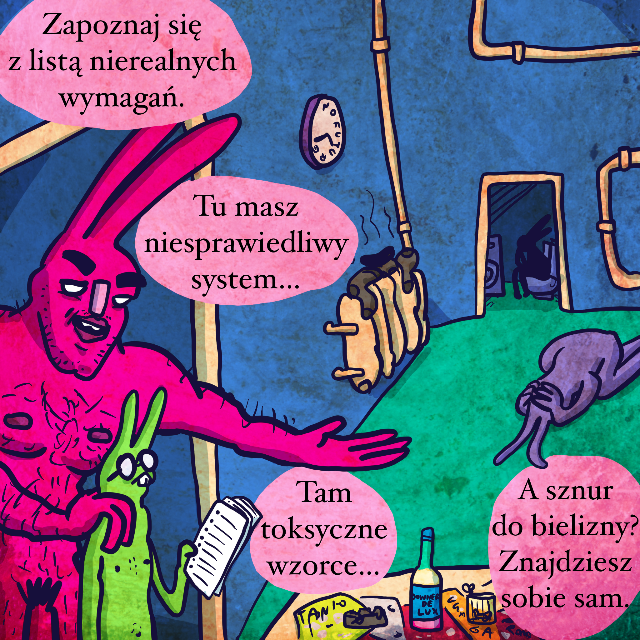 O męskich ofiarach patriarchatu. W tytule jest nawiązanie do H&M, wtedy robiło kampanię reklamową z brodą. Tak, uczmy chłopców polegania wyłącznie na sobie, wepchnijmy ich do chujowej fizycznej pracy, pompujmy alkohol każdego dnia, do tego olejmy naukę higieny, sprzątania i gotowania. Potem dieta kiełbasiana, gazety jako nakrycie stołu, wóda i faje, żeby zdążyć z zawałem przed samobójstwem. Tak się kurwa nie da żyć, ale wpycha się w to bagno chłopaków, którzy chcą zarobić cokolwiek, wyjeżdżając do pracy za granicę albo do większego miasta. Trafią do hotelu pracowniczego, będą nakręcać się kto więcej wypije, jak bardzo się zniszczy, więcej agresji, pilnowanie dupy, żeby nie odstawać i zero szukania pomocy, rozmawiania o uczuciach. Chyba, że uda się tak najebać, że w końcu puszczą bariery i zacznie się misiowe przytulanie, płakanie po papieżu i co tam jeszcze na sercu zalegało. Ale następnego dnia udamy, że nic się nie działo i wrócimy do kombinatu. Jebać ten system, jebać to, że muszę ciągle się go oduczać, tak głęboko ta kurwa siedzi.