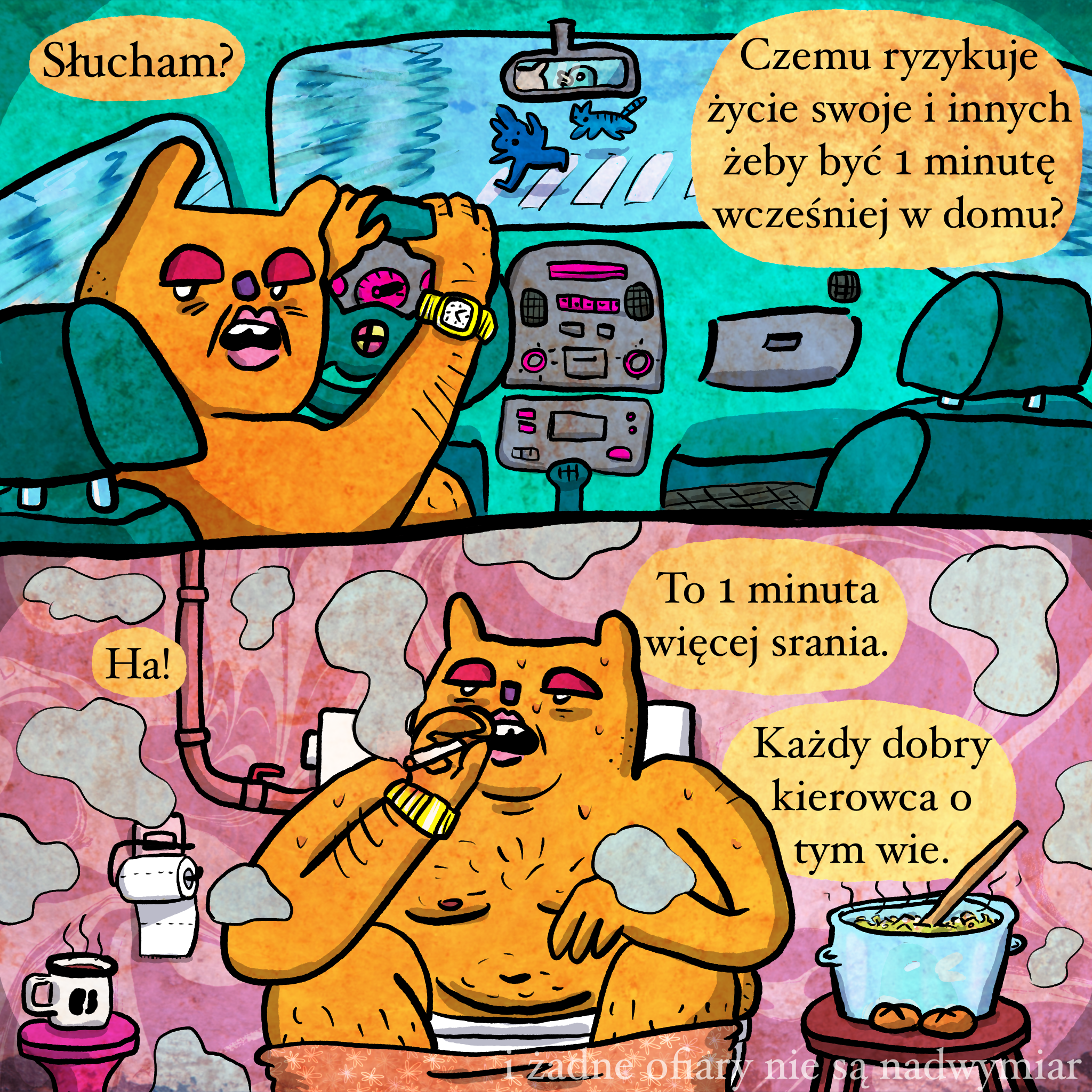 Nie rozumiem kurwa, gdzie się te chuje tak spieszą. Będą ryzykować życie, wyprzedzać na pasach, ledwo się mieszcząc, byle potem i tak stać na światłach, ale za to być o jeden samochód do przodu. Zaoszczędzą kurwa tyle co nic czasu. Nie ma to jak podwyższać ryzyko przy wykonywaniu najniebezpieczniejszej czynności dnia codziennego, od której można zginąć lub dostać trwałego uszczerbku na zdrowiu. Tacy kierowcy jebią gównem, jedzą gówno, palą gówno i mają gówno w głowie. Fani gówna i srania.