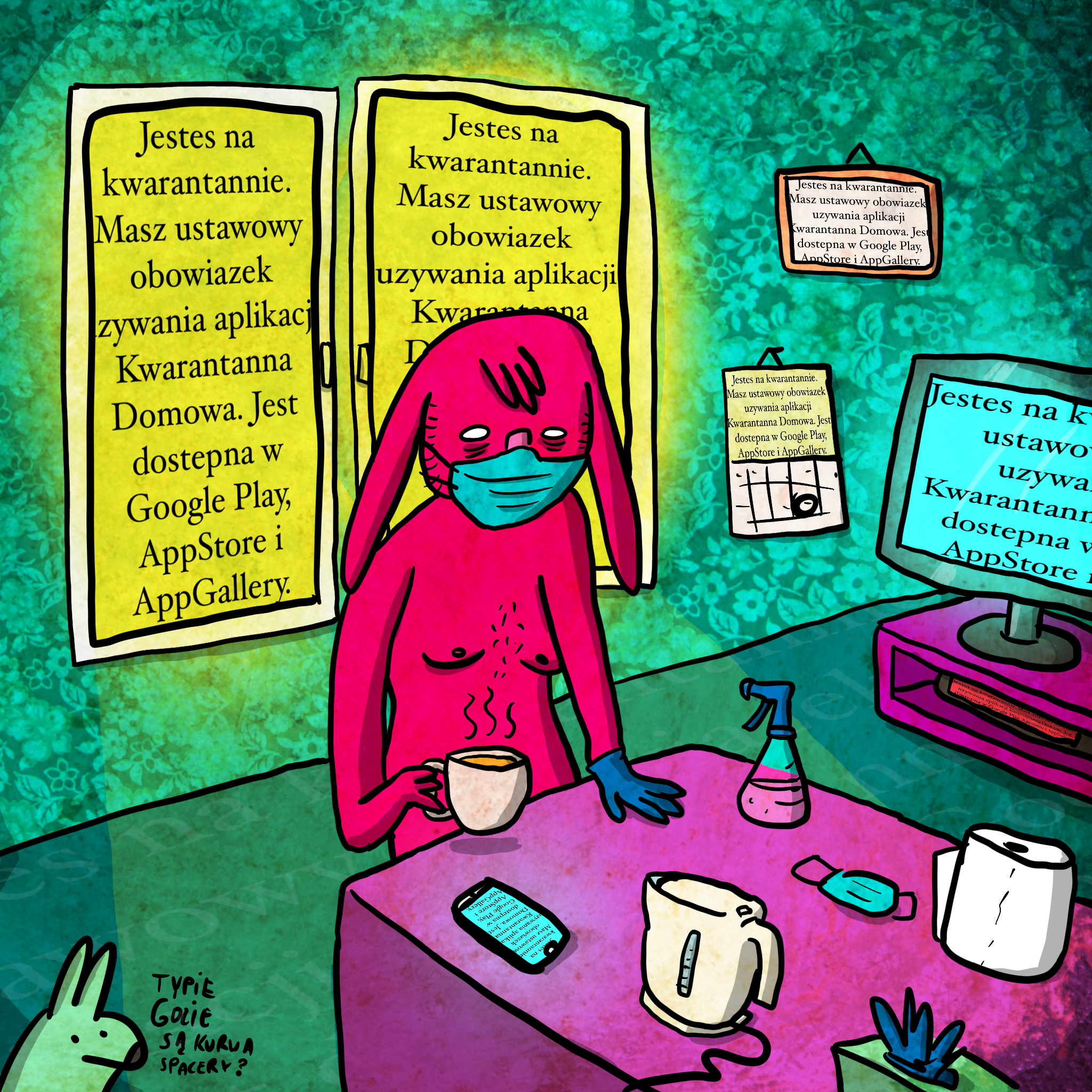 Rok pandemii i w końcu pojawił się COVID w domu. Co ciekawe mnie wyszedł test negatywny, innej osobie pozytywny, ale objawy choroby miałem podobne. Ciągle przychodziły te jebane smsy z nakazem instalacji jakiejś chujowej aplikacji na telefon. Nie, dziękuję, nie mam czasu, chory jestem, bolą mnie mięśnie, męczy mnie kaszel. Nie jestem socjopatą gotowym wychodzić z domu, żeby zarażać innych. Nie trzeba mnie pilnować jak dziecka, dajcie mi kurwa spokój.