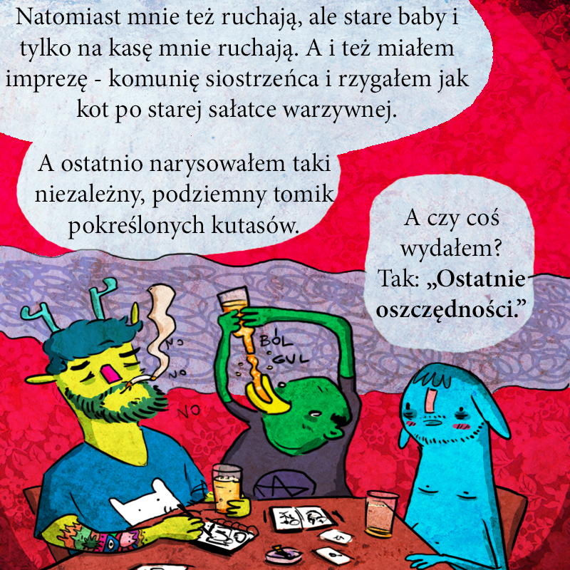 To jest o moich kompleksach komiksowych. Zawsze się czuję dziwnie na festiwalach komiksowych, bo tylko na nielicznych byłem tam w roli twórcy/autora i to zawsze jako scenarzysta, nie rysownik. Siedzenie w strefie autografów gdy jesteś no namem jest strasznie dołującym doświadczeniem. Prawie nikt nie przyjdzie, a ja i tak niczego nie mam do narysowania. Tragedia.