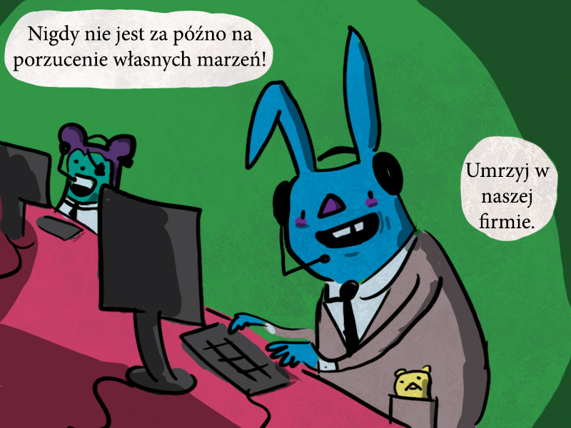 Magical Work Time nawiązuje do świetnego tumblra Magical Game Time Zaca Gormana pełnego cudownych, animowanych komiksów wypchanych nostalgią. Od niego zapożyczyłem króliczą postać, która, po różnych ewolucjach, stała się wizytówką Żóla. Sami widzicie, tu wszystko jest kradzione :/ Chętnie też zapożyczyłbym formę komiksów z fragmentami animowanym, ale przez to, że facebook nie obsługuje gifów jak należy, musiałem odpuścić. Ale teraz, gdy mam stronkę? Kto wie…