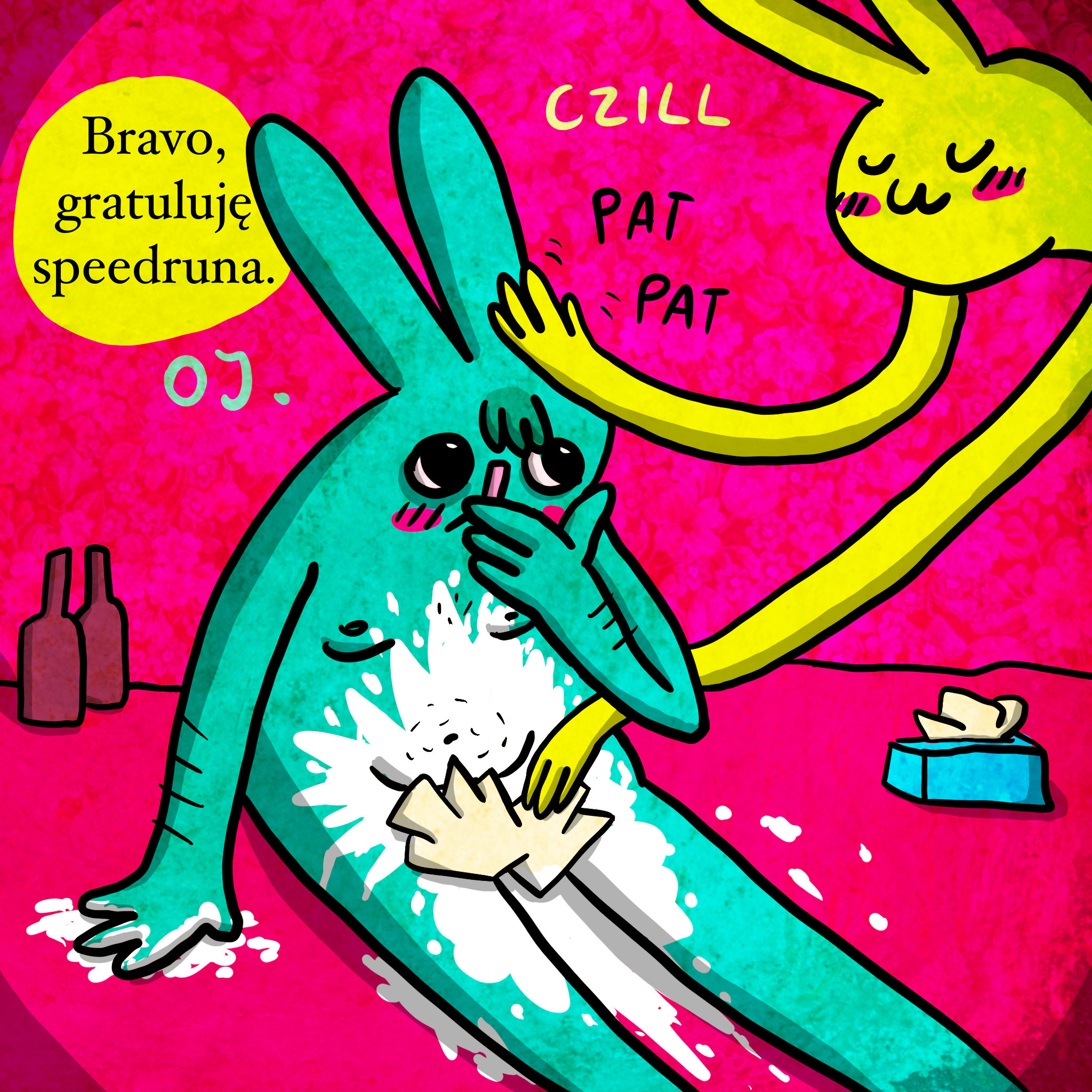 Ilustracja bez tekstu wpadła na kratę „Ospermiony” karcianki Ciemna Strona Mydła. Poza mną dużo innych komiksiarzy coś naskrobało. Jak ktoś lubi karcianki, w których jest dużo chaosu i humor w stylu Cards Against Humanity, to polecam.