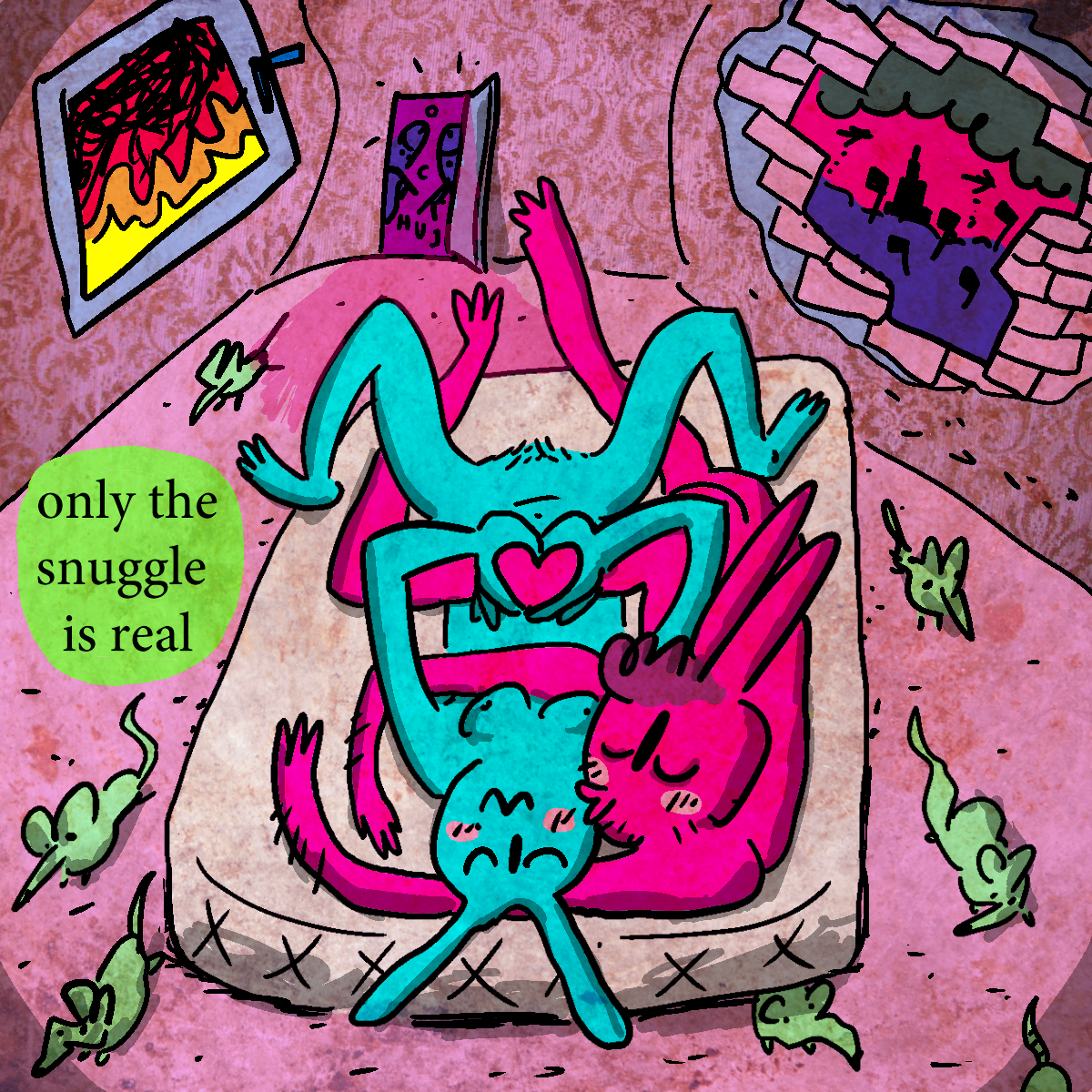 Ten komiks to jeden z powodów, dla których istnieją te spojlery, bo ile osób zna ten kawałek Mountain Goats? Pewnie te kilka osób, które jak ja, usłyszały polecajkę od Dema. Wszystko bezpośrednio nawiązuje do tego utworu, poza snuggle is real, które jest przeróbką zwrotu struggle is real. Przeciwności losu mogą być być uciążliwe i męczące, ale to wszystko chuj, gdy ma się doświadczenie miłości i czułości. Dla mnie jest to najlepszą, najrealniejszą częścią życia.