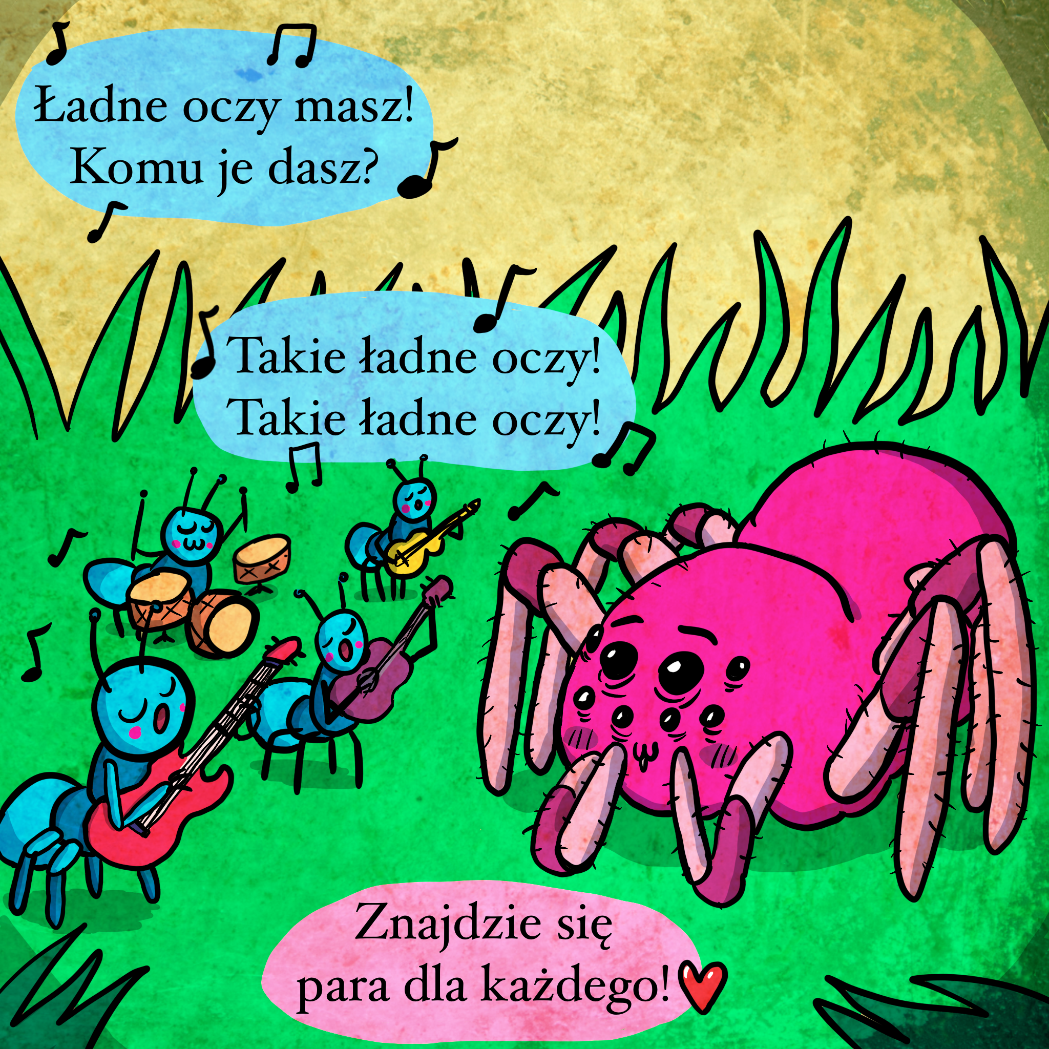 Mróweczki grają utwór Takie ładne oczy Czerwonych Gitar. Pająki mają cztery pary oczu i na tym cały żarcik się opiera.