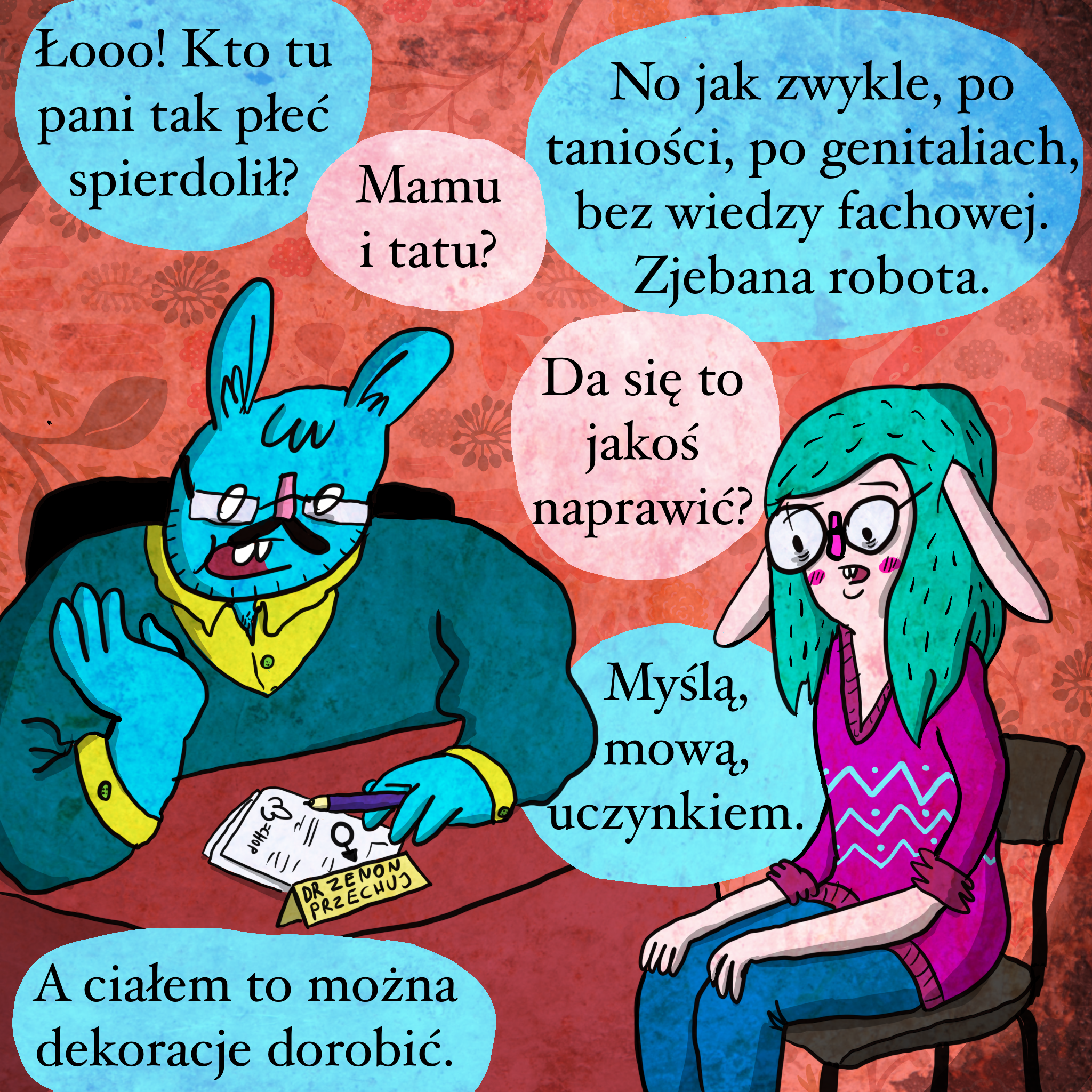 Ok, jako, że jestem cishet białym mężczyzną, to oczywiście muszę robić komiksy o tematach, które mnie nie dotyczą. Jednak wizja majstra kto-tu-panu-tak-spierdolił pomagającego w uzgodnieniu prawnym płci mnie troszku bawiła. Do tego trochę słabo, że społeczeństwo ciśnie jak nie do detranzycji, to do pełnej tranzycji z wszystkimi operacjami. Jestem team rób to z czym lepiej się czujesz, jednak gdy passing jest potrzebny do czucia się lepiej, w grę wchodzi dostrajanie się do wizerunku płci w społeczeństwie i ta presja jest chujowa. Przecież to wszystko tylko dekoracje. Mamy „progres” w tej kwestii ostatnio, teraz osoby cis i trans są jednakowo prześwietlane i misgenderowane, przez speców od żuchw, nosów, czół i miednic.
