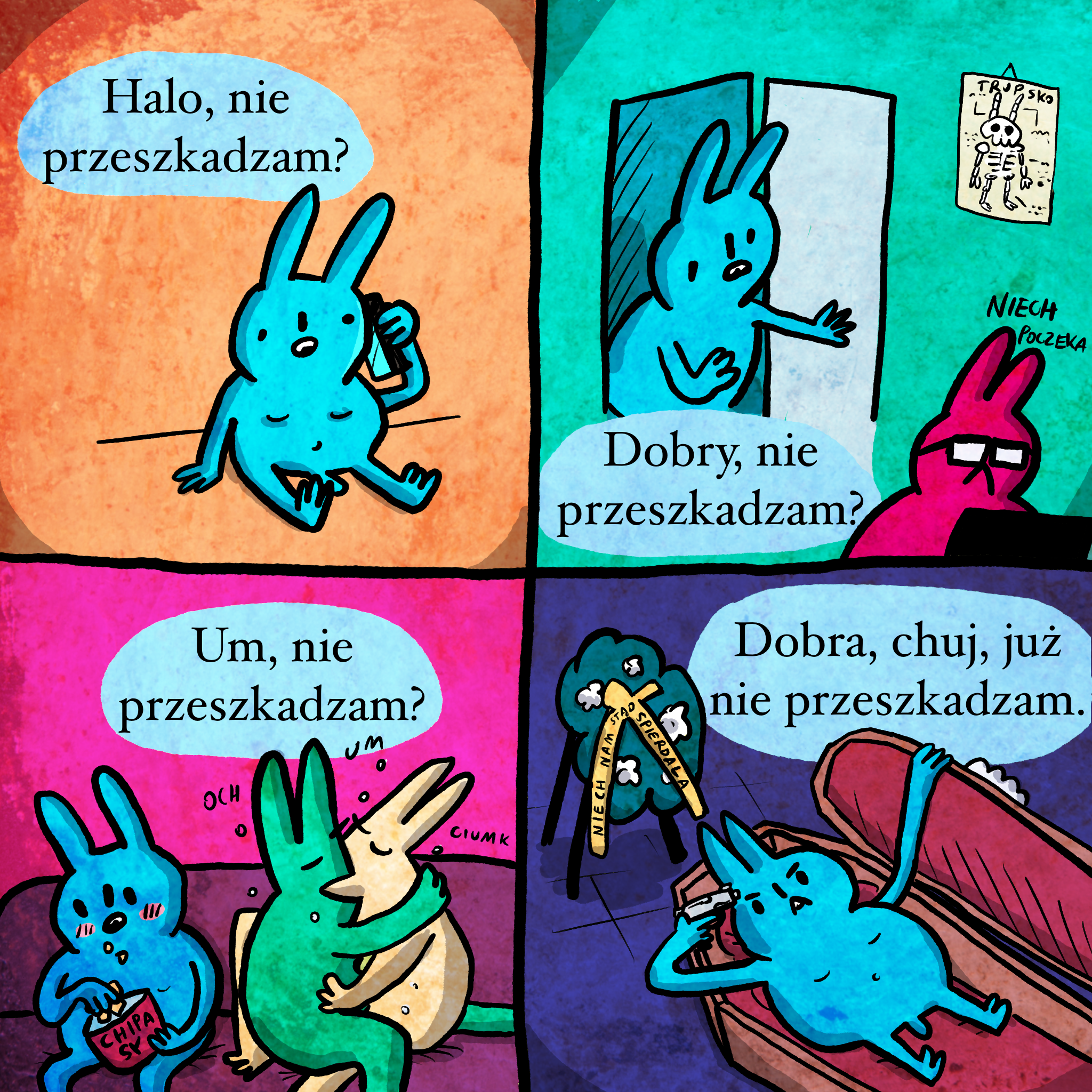 Odwieczne poczucie bycia czyimś kłopotem, które ma źródło w poczuciu bycia gorszym, mniej ważnym od innych. Bo przecież ich potrzeby są ważniejsze od moich. Przecież ja, to ja, mogę odpuścić, ustąpić, bo jakie w ogóle mam potrzeby? Można się w końcu złamać, wkurwić i mieć dosyć tych lęków. Króliczek wybrał jedno rozwiązanie, ale czy nie jest zbyt samolubne? Hm?