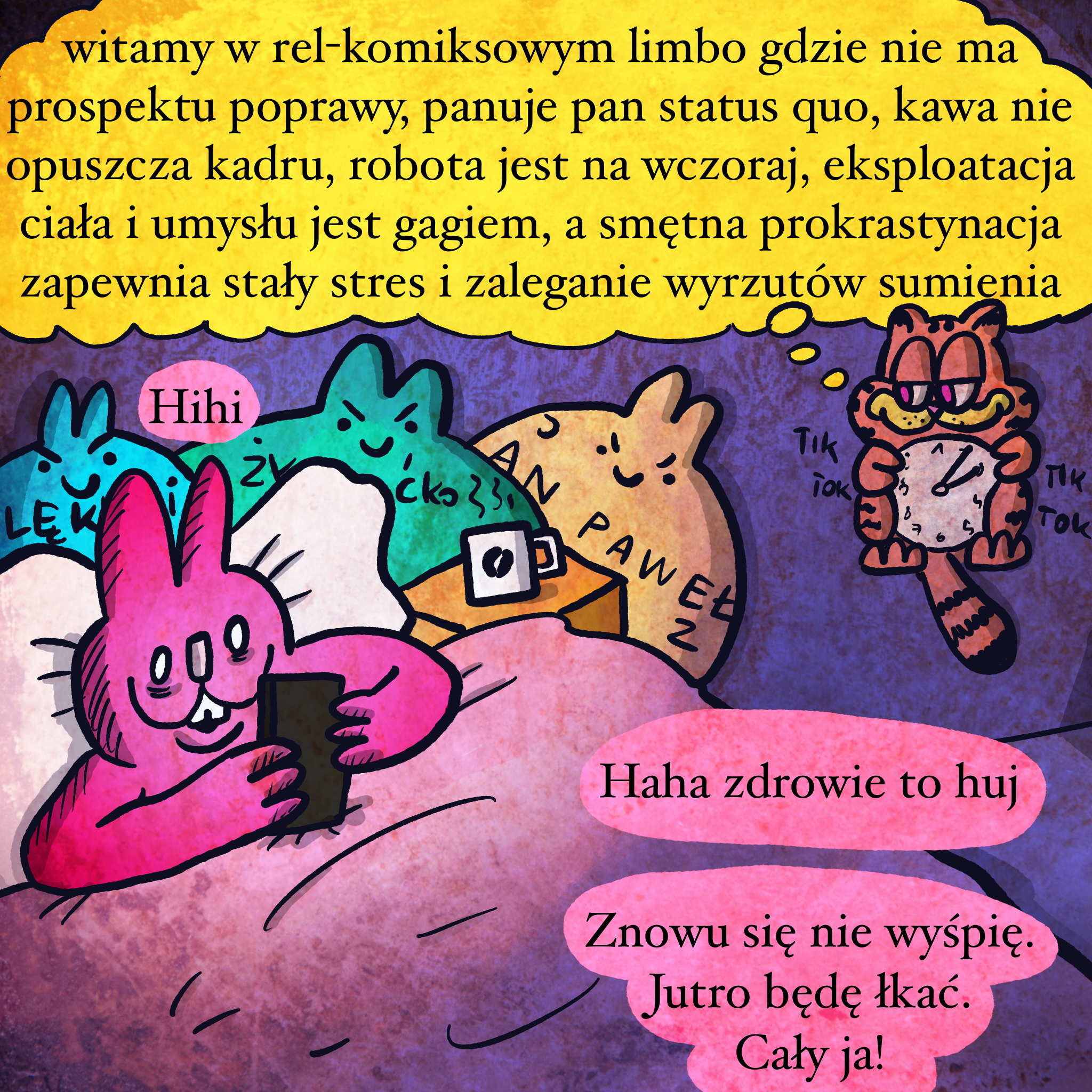 Zainspirowane tym mądrym esejem. TL;DR komiksy, które są relatable, nie dotykają problemu, tylko normalizują eksploatowanie się w pracy, pogłębianie mechanizmów unikających i kiedyś się kurwa obudzisz z ręką w nocniku w psychiatryku kurwa. Dobra przesadzam, ale jebać komiksy, które z autodestrukcji robią swoją tożsamość. Można powiedzieć, że trochę taki bywa Żól Bycia, ale nie wiem, czy kiedykolwiek przedstawiałem swoje chlanie czy rozbijanie się jako coś cool, albo quirk. Teraz piję tylko wodę i herbatę. To jest dopiero cool opcja mordo.
