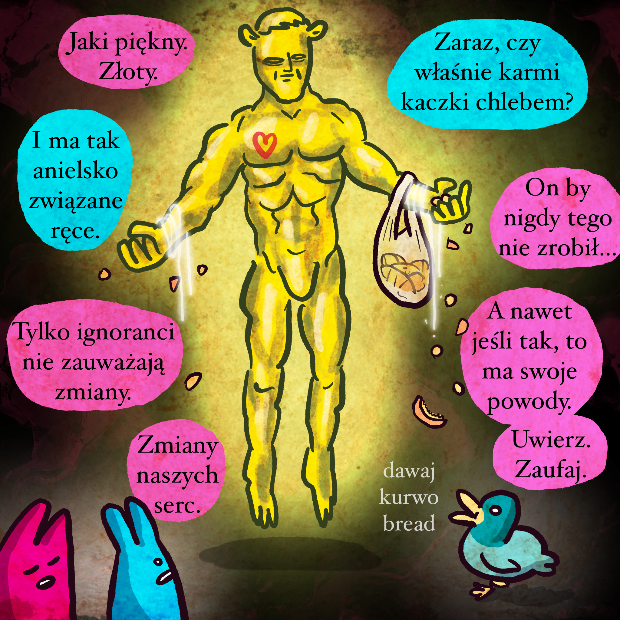 Bóg jest oparty na jednej postaci z gry Fear & Hunger. Serduszko umyślnie po prawej. Dawaj kurwo bread nawiązuje do mojego ukochanego mema dawaj kurwo weed/lufen machen.