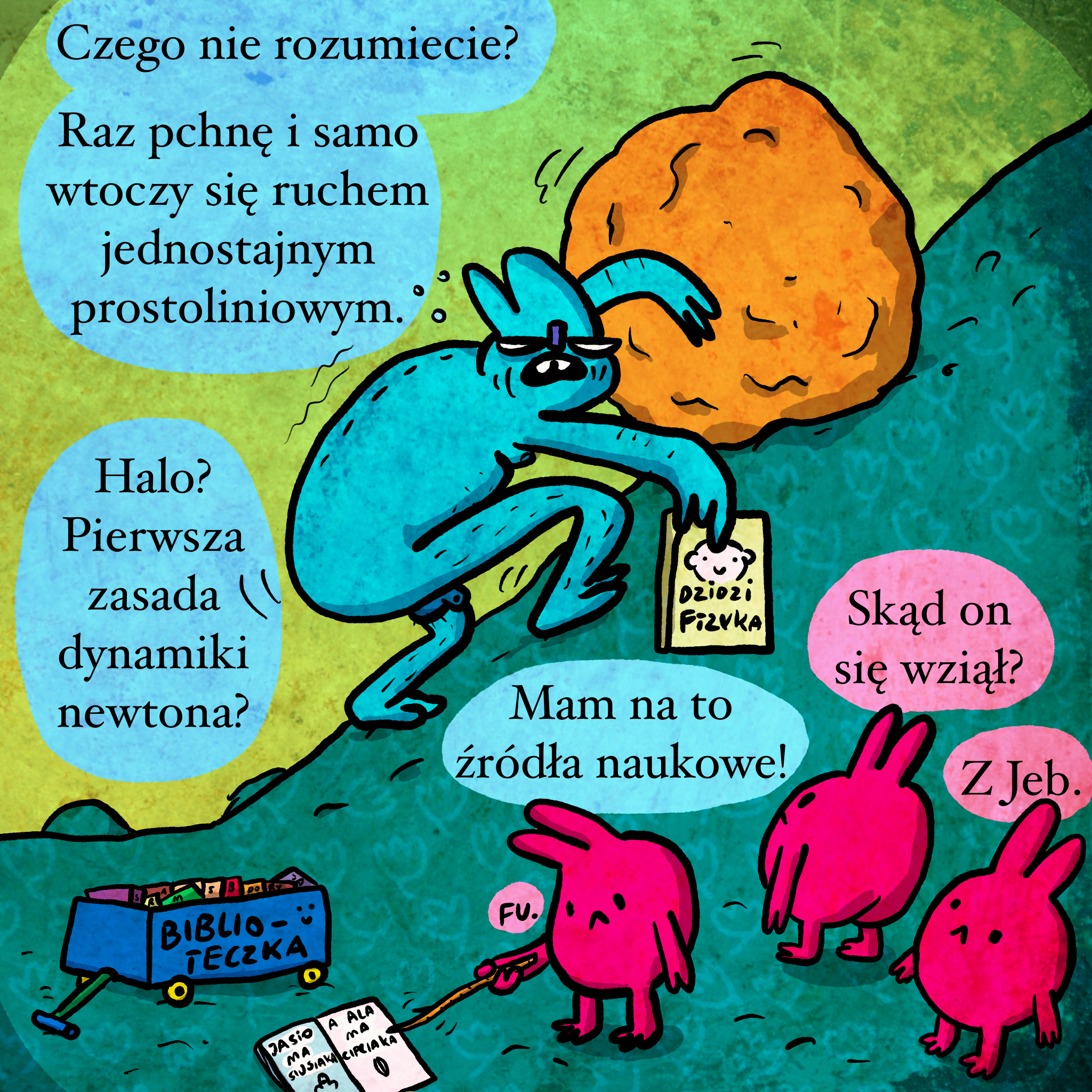 Skojarzyło mi się to z zasadami dynamiki Newtona i abstrakcyjnymi wyliczeniami, które się robiło w szkole, gdy jeszcze było za wcześnie, żeby omówić siłę tarcia czy grawitację. Nic tylko z taką wiedzą iść jak Syzyf pod górę z głazem, bo ciało raz wprawione w ruch zapierdala w nieskończoność.