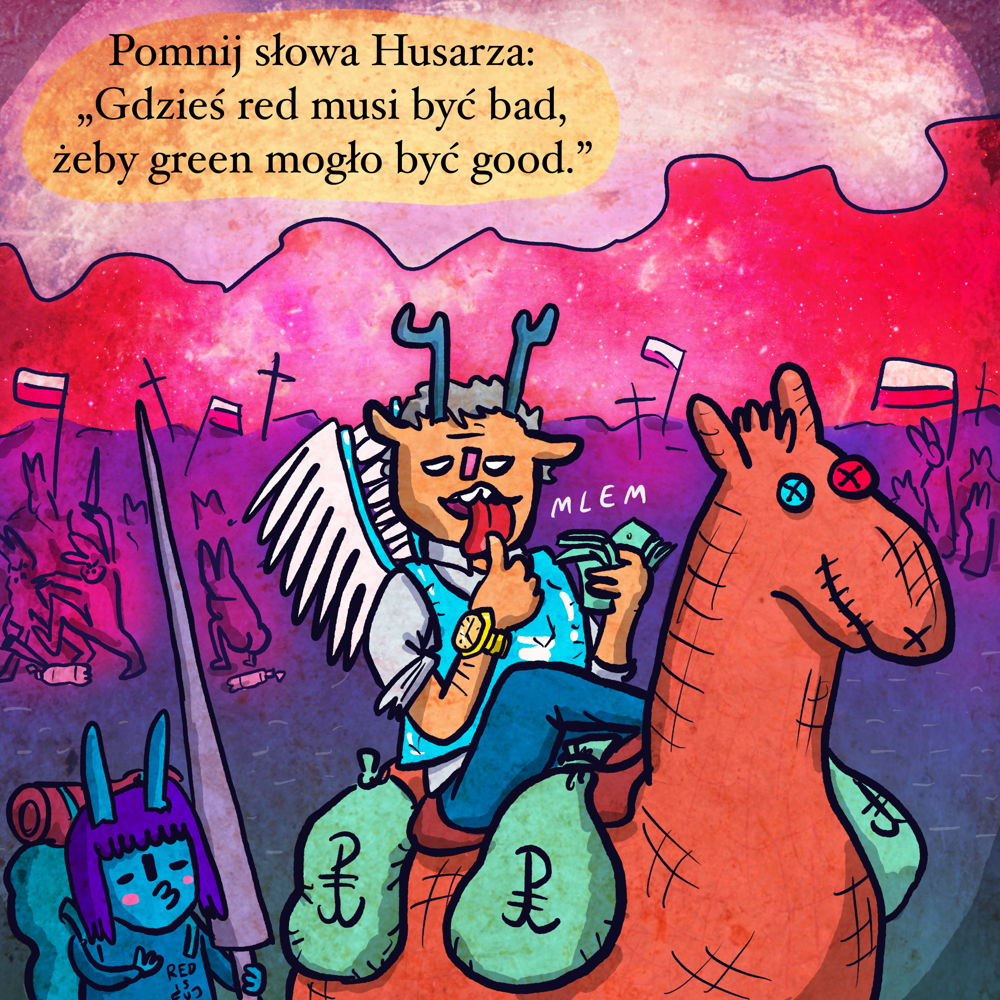 Komiks o ostatniej aferce patriotycznej. Gdzie znalazło się więcej dowodów na przesrywanie pieniędzy z budżetu na propagandę i nagradzanie tłustych kotów z Red is Bad za współpracę z partią. Koń naszego biznes patrioty nawiązuje do filmowego Misia, wszak i tu mamy cwaniaczkowanie i topienie kasy. Woreczki są ze zmyślonymi Polsko Walczącymi walutami. W tle można zobaczyć dzielnych prawych chłopców na polu bitwy z zakrętkami od butelek. Ostatnio każdy eurosceptyk musi pociąć sobie nimi ryj i zrobić nieporadną gałę butelce.