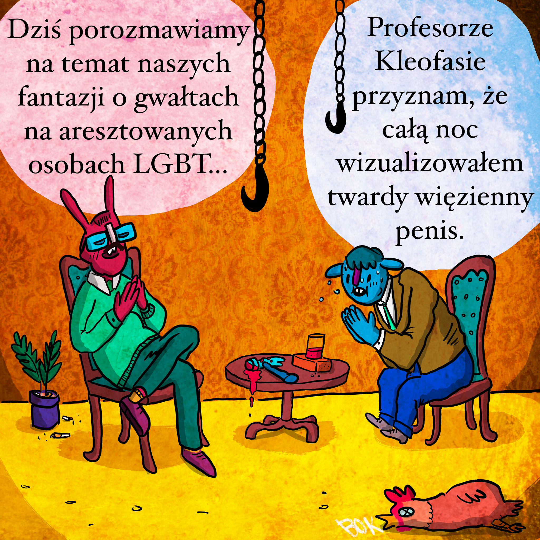 Nawiązanie do tej samej sprawy co poprzedni komiks, tym razem nasi rodzimi publicyści dzielili się swoimi popierdolonymi fantazjami o umieszczaniu w aresztach osób niezgodnie z deklarowaną płcią.