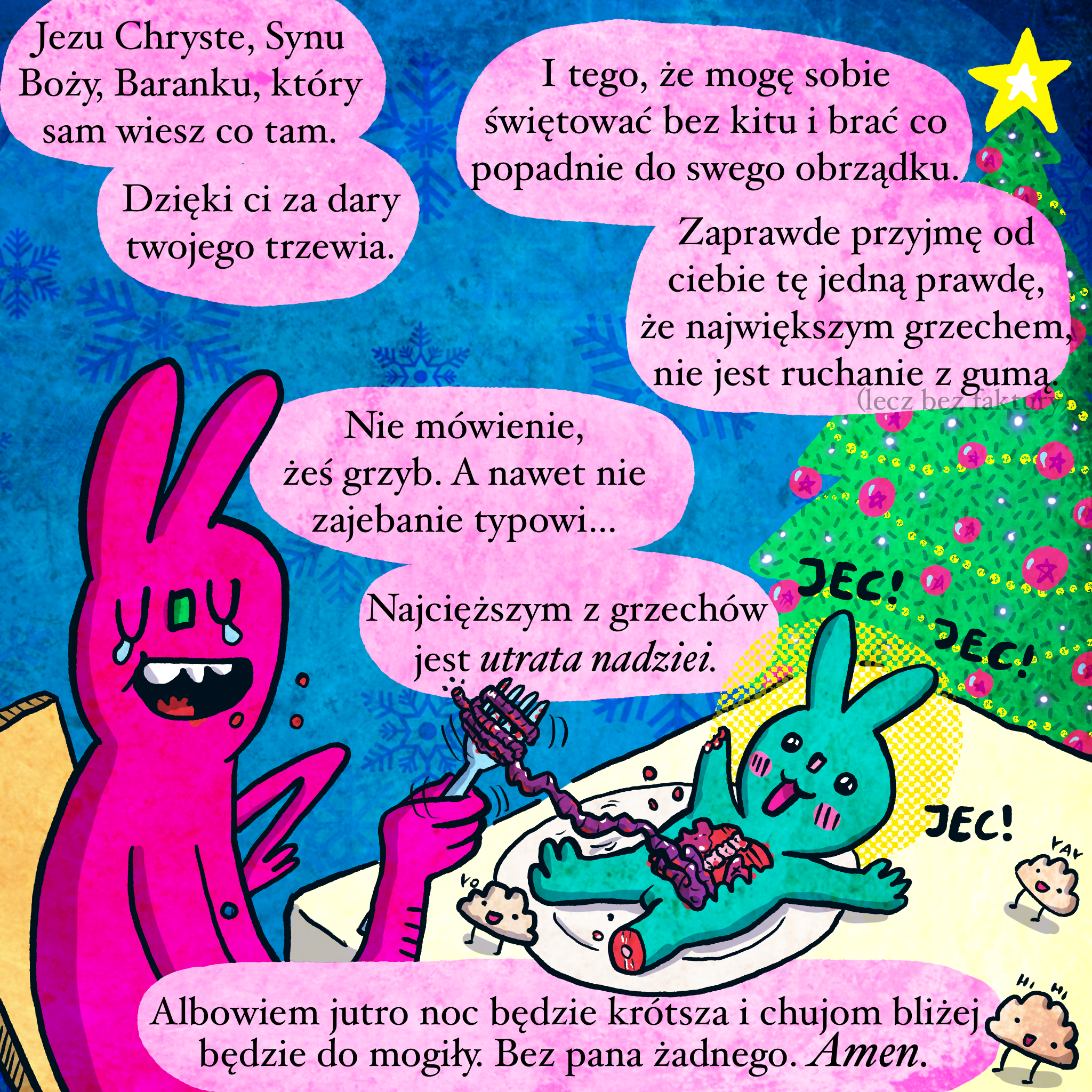 Co to za świąteczny gatekeeping? Możemy się inspirować filozofią, symboliką itd., bo w końcu w większości się wychowywaliśmy w tej tradycji i już jako dorośli możemy świadomie kreować własną tożsamość. Dlatego chętnie potraktuje Boże Narodzenie jako święto nadziei i pewności, że noc będzie krótsza, mróz odpuści i przyjdzie wiosna pełna życia i zieleni. Może być też świętem literalnego pożerania ciała Chrystusa. Czemu nie?