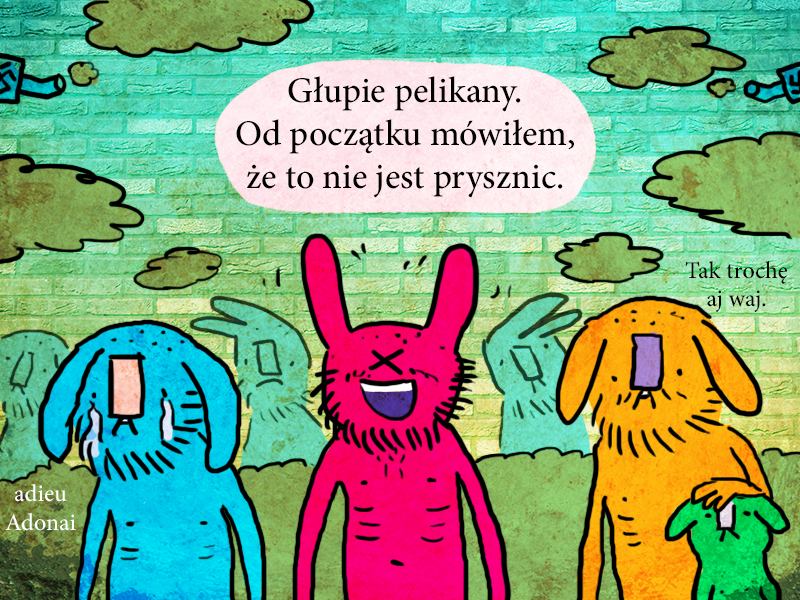 No jak mnie wkurwiają takie przemądrzałe typki, obesrane sarkazmem, patrzące na wszystkich z góry. Wiedzą wszystko, wszystko przewidzieli, głupie społeczeństwo nie jest godne ich złocistych słów prawdy. Właściwie ich wkład w to „głupie społeczeństwo” jest kurwa zerowy i w niczym nigdy nie pomogą. Zesrają się na środku potłuczonego talerza. To ich wkład.