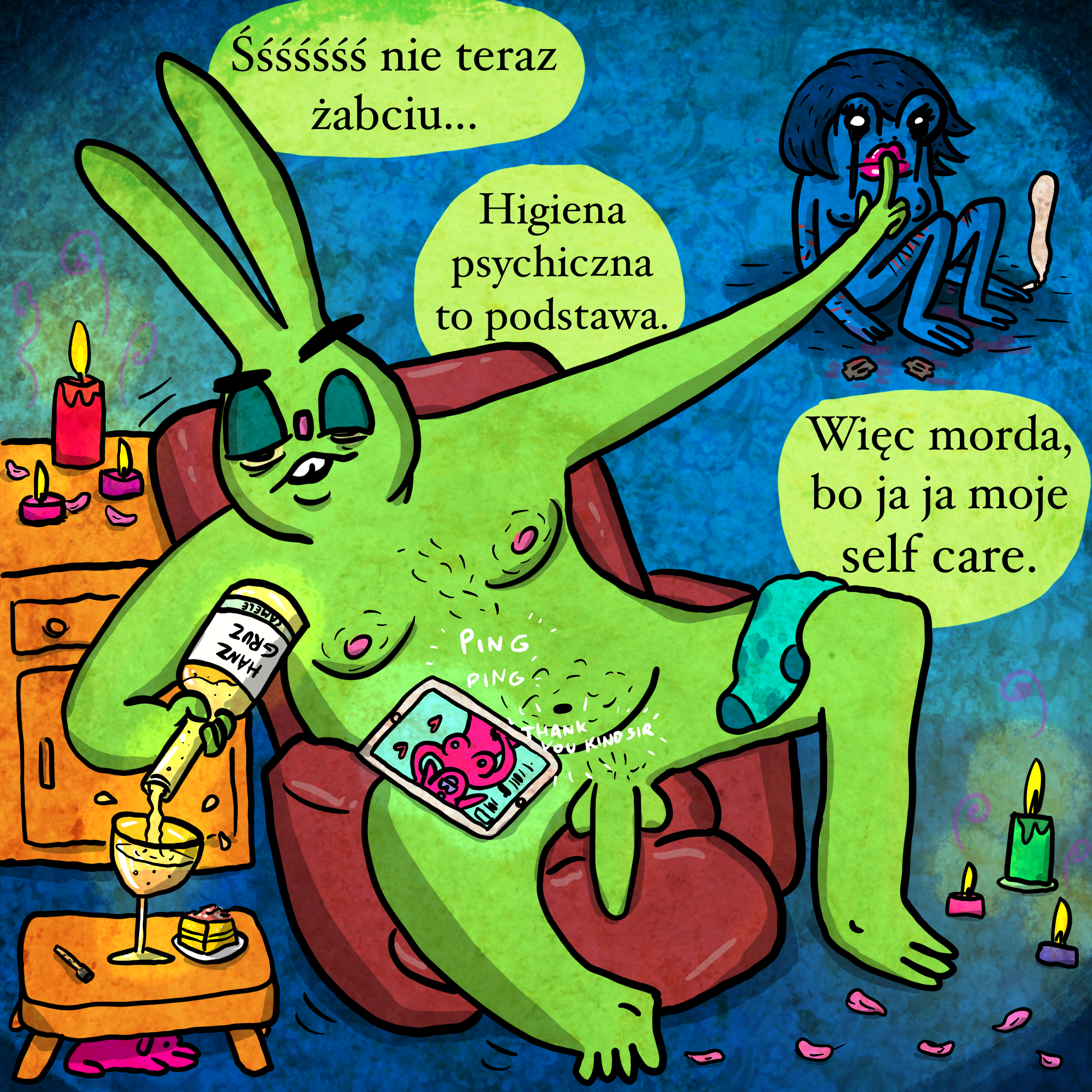 Nie jest to najładniejszy komiks, pod wieloma względami. Jest dosyć autobiograficzny i nie będę tutaj wchodzić w prywatne szczegóły, bo nie tylko mnie one dotyczą. Dosyć chujowa sprawa z selfcarem, bo z jednej strony nikomu nie będziesz w stanie pomóc, jeżeli wcześniej nie zadbasz o siebie i własne potrzeby. Nie będziesz mieć na to energii i siły woli. Z drugiej, zbytnie skupienie się na sobie może doprowadzić do zamknięcia się na potrzeby innych. Teraz zdecydowanie bliższa jest mi pierwsza opcja, bo żeby zbawić świat, trzeba najpierw wstać z łóżka, a nie zrobisz tego, jak się będziesz obwiniać o każdą jebaną sytuację. W tym komiksie obwiniam się jak samchuj i to już do toksycznego punktu. Dlatego wywaliłem go z facebooka, gdzie trochę nie jest miejsce na tego typu szokowanie bez ostrzeżenia i kontekstu. Tu mogę dać wiadomość dla samego siebie i innych: Masz prawo nie wiedzieć, co zrobić i jak komuś pomóc. Masz też prawo sobie wybaczyć potknięcia. Masz prawo szukać w sobie dobra. Masz prawo zachować milczenie, jesteście aresztowani za kontakt z niedorzeczną ilością frazesów (ale słusznych, ok?)!