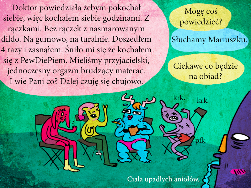 Komiks zainspirowany opowieściami kolegi, z terapii grupowej. Faktycznie typ przerywał pieprząc o jedzeniu, gdy ktoś w tym czasie wyrzucał z siebie największe traumy. Sam nigdy na terapii nie byłem, zbieram się i zebrać się nie mogę. Chciałbym skonfrontować swoje problemy z unikaniem, ale przeszkadzają mi w tym problemy z unikaniem.