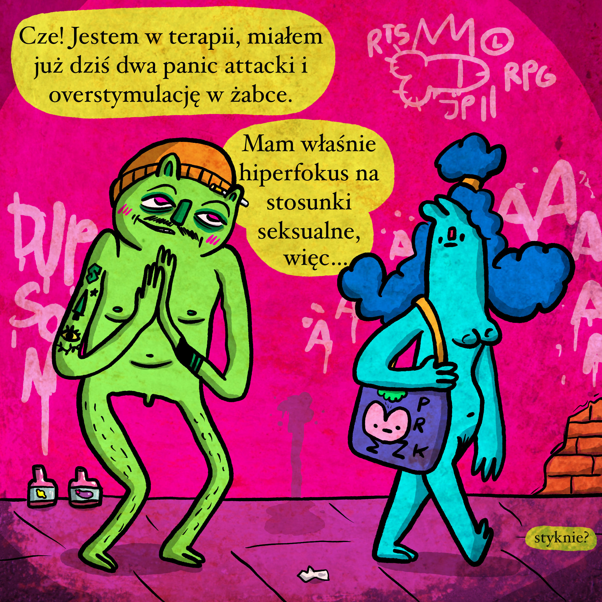 • Hiperfokus – łapanie czasowego pierdolca na punkcie jednego tematu. ADHDowe. Sam ostatnio miałem tak przy graniu w gierkę. Przechodzę ją normalnie, czytam i analizuję wiki, do tego oglądam na youtubie jak dwie inne osoby w to grają, recenzje, analizy itp. Nie da się mnie od tego odciągnąć, a potem cyk, znudzi się i znajduję sobie coś nowego. Np. naukę animacji, bo czas zrobić profil na tik toku xD