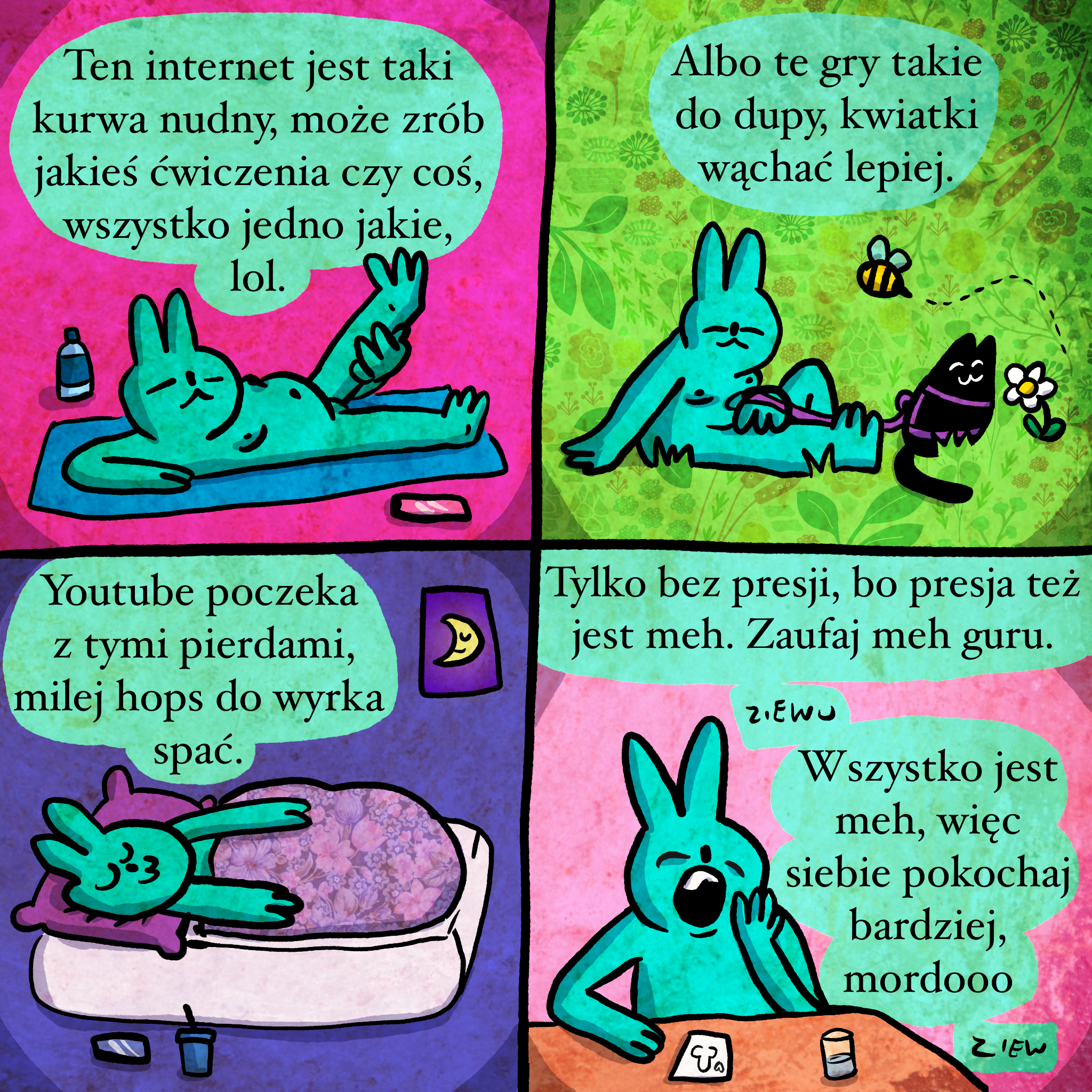 Zauważyłem, że najlepszą motywacją, jaka na mnie działa, to brak motywacji. Im mniej myślę, tym łatwiej coś zmienić. Entuzjazm bijący z różnych treści motywacyjnych zupełnie odstrasza i zniechęca do działania. A jak jest wszystko jedno, to też wszystko jedno czy poćwiczę, czy nie, więc mogę poćwiczyć. Dobrym rozbiegiem może być takie przesycenie się rozrywką, gdzie już granie i socjale zaczynają irytować. Wtedy cyk, wcześniej do wyrka i jebać FOMO. Nic się nie straci. Czasami mam wrażenie, że ta moja filozofia ma w sobie trochę anhedonii, albo nihilizmu, ale nie chce mi się o tym myśleć więcej. Może poćwiczę. Whatever.