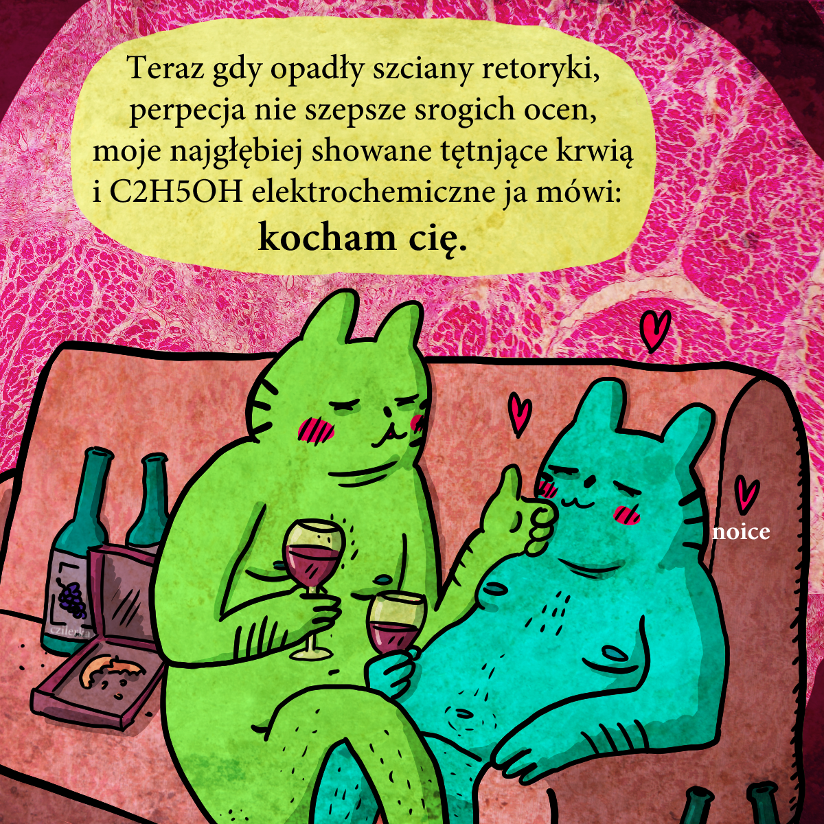 Inspiracją jest jedna z najlepszych gier („książek”): Disco Elysium. Tam występują wymienione skille: retoryka, percepcja i elektrochemia. Ten ostatni odpowiada za skłonności do nadużywania różnych substancji psychoaktywnych, imprezowania, a także do wszelakich czynności seksualnych. Bardzo wesoły koleś. W grze też pada „I want to have fuck with you.” jeżeli nie zdamy bardzo trudnego rzutu na sugestię. Piękny moment. Odchodząc od gry, to bardziej moja przypadłość, że ciężko mi jest wyrażać uczucia, gdy mam cały zapas wątpliwości, lęków i wewnętrznych cenzorów czy barier. Tylko ten jebany alkohol pomaga znosić te ograniczenia. Albo odwaga. W to drugie warto inwestować.