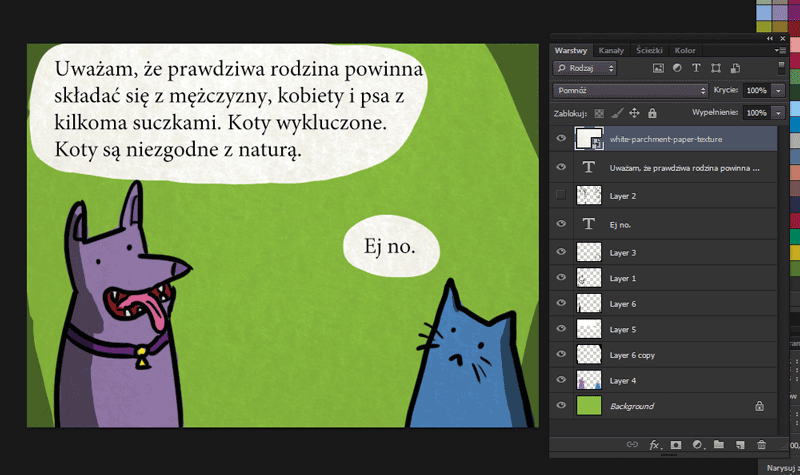 Tak to wyglądało. Straszna nędza, warstwy nienazwane, cienie to zwykła czerń z opacity ~40% i jakaś biedna tekstura papierowa z Multiply.