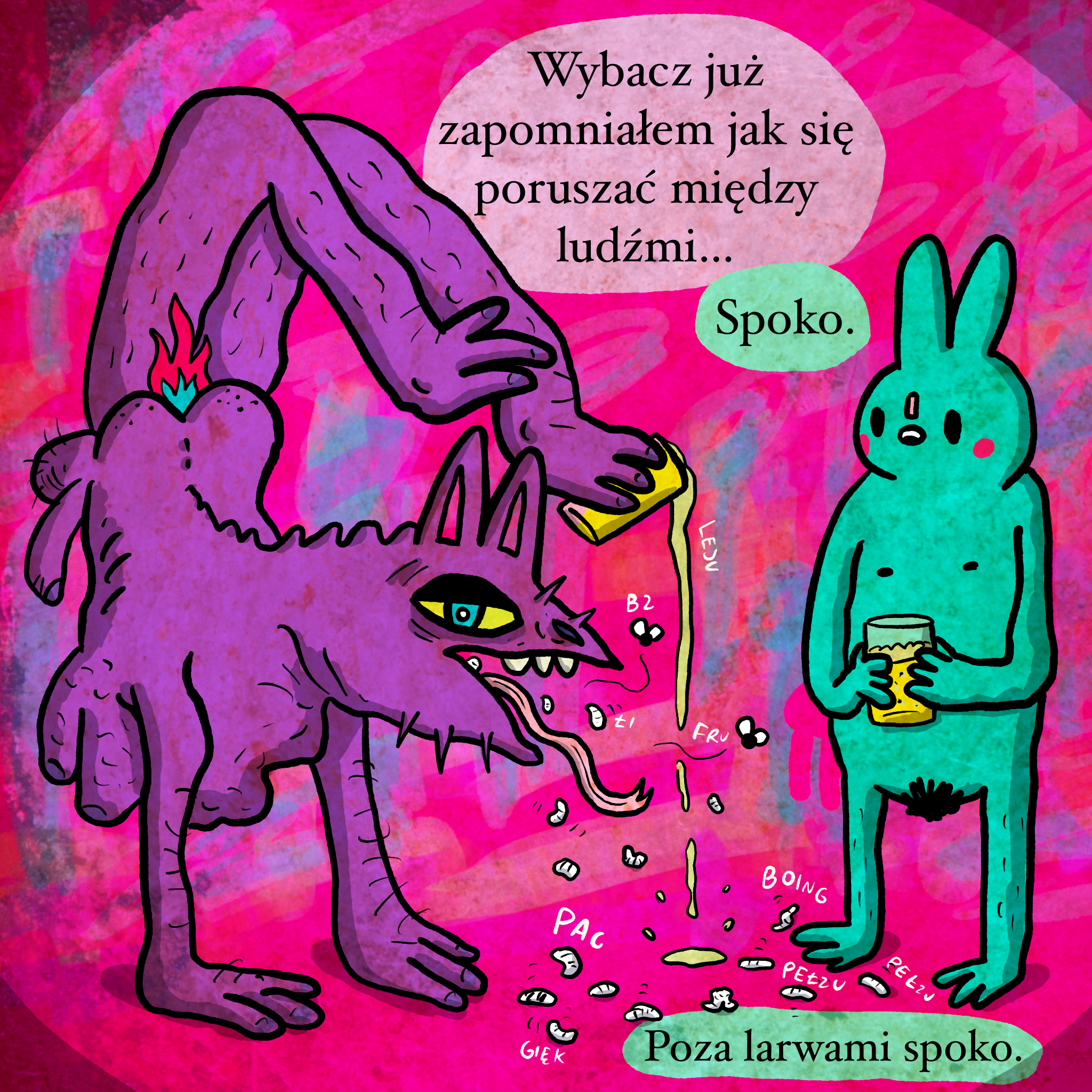 Komiks z okazji wyjścia z domu pierwszy raz od dłuższego czasu. Wiem, że mam mocno zardzewiałe umiejętności poruszania się w sytuacjach społecznych, a to, że odstawiłem alkohol dodatkowo nie ułatwia sprawy.