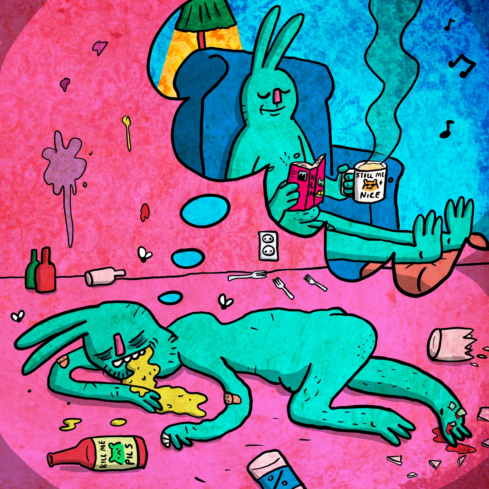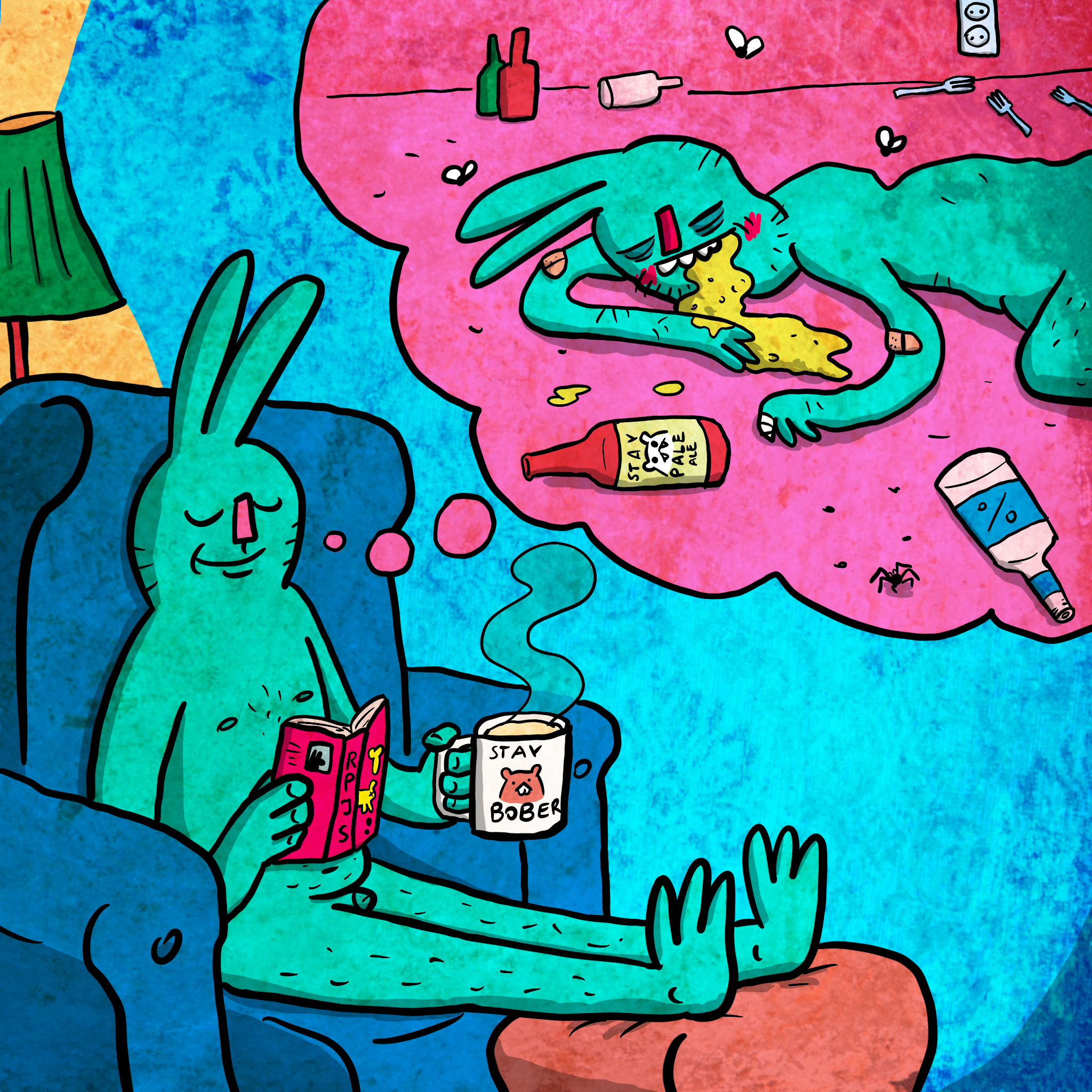 Tu mamy parę fajnych rzeczy: W pierwszym kadrze królik czyta książkę Rucham Psa Jak Sra, pije z kubeczka Stay Bober, który brzmi jak stay sober. Na butelce jest Stay Pale Ale, gdzie pale ale jest stylem piwnym, ale pale to też bladość, stąd mamy wampira na etykiecie. Na drugim kadrze mamy książkę Koty Liżą Masło (nawiązanie do tej sceny ze Świata według Ludwiczka), na butelce piwerka jest Kill Me Pils, które brzmi jak mem kill me pls, a na kubku podobnie brzmiące, lecz z pozytywniejszym przekazem Still Me, Nice.